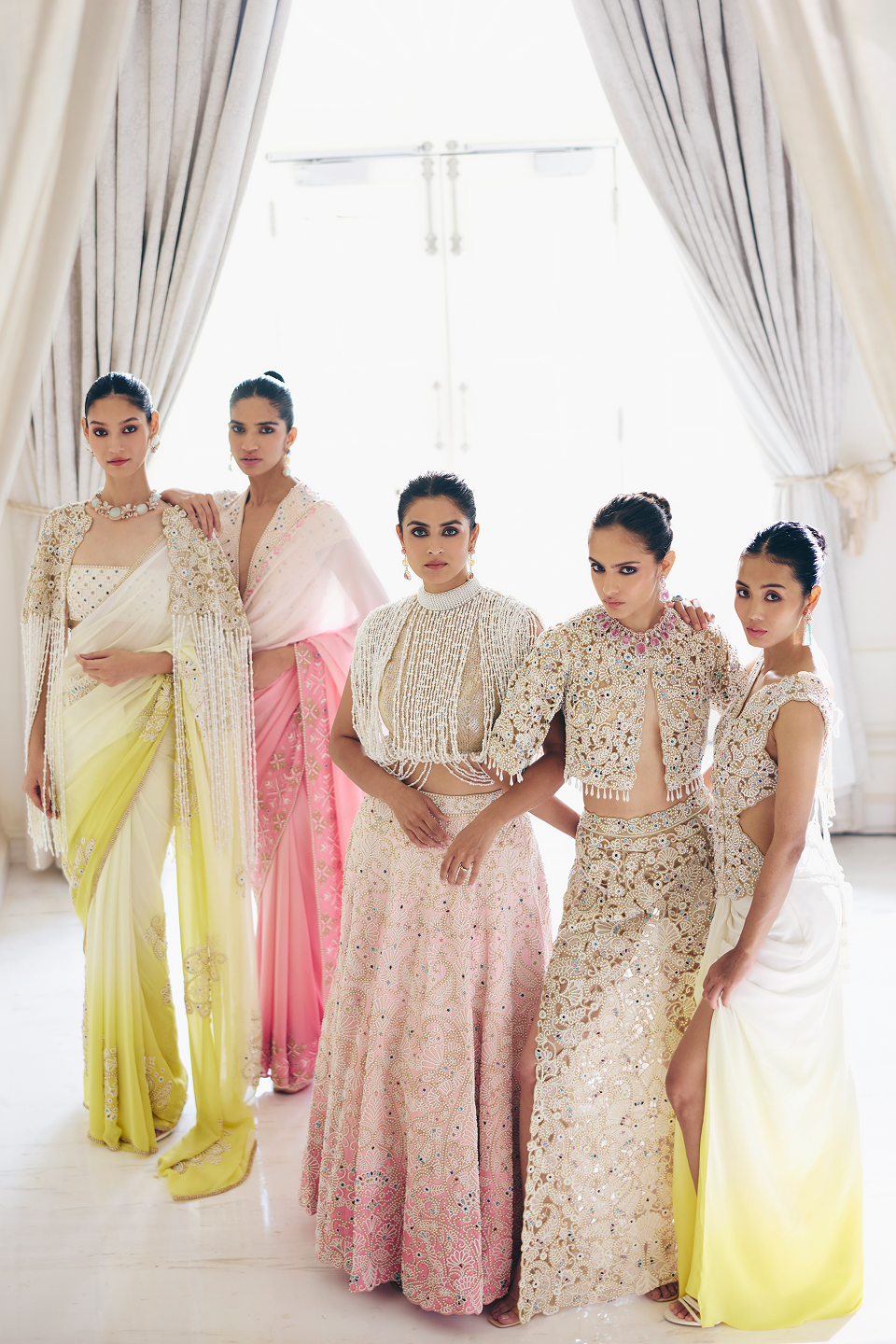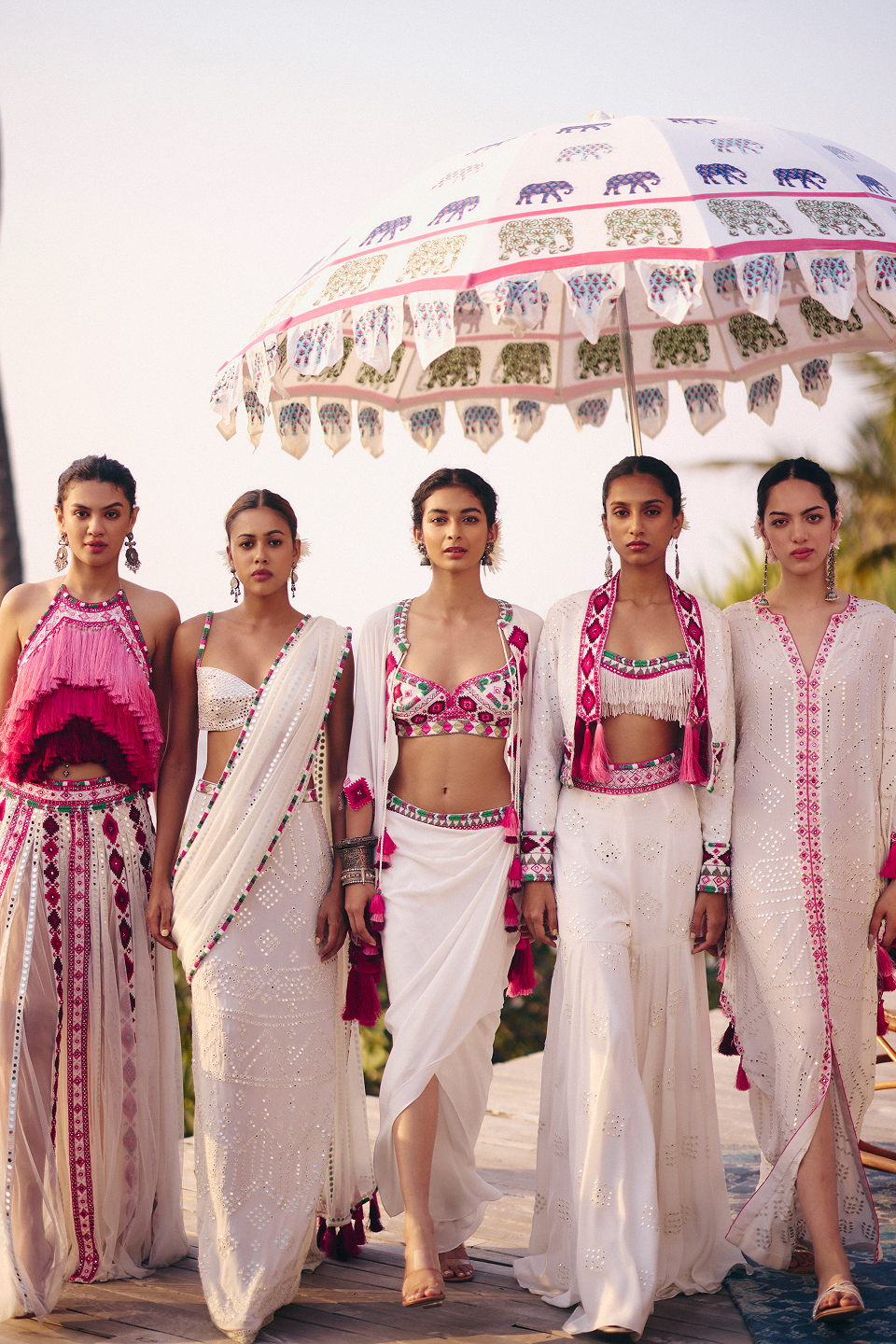 In November 2003, FIDM Los Angeles graduate Surily DP Goel founded her eponymous label, Surily G. An ode to the things she loves in life, Surily G offers Indian and western fashion that elevates your mood and the way you look. Inspired by the world around her, Surily takes notes from cinema, music, art, travel, food and her own experiences to design collections that are not led by trends but by mood. Best known for her resortwear and destination wedding ready fashion, Surily is a master of embellishment and you will find everything from feathers to seashells on her pieces.