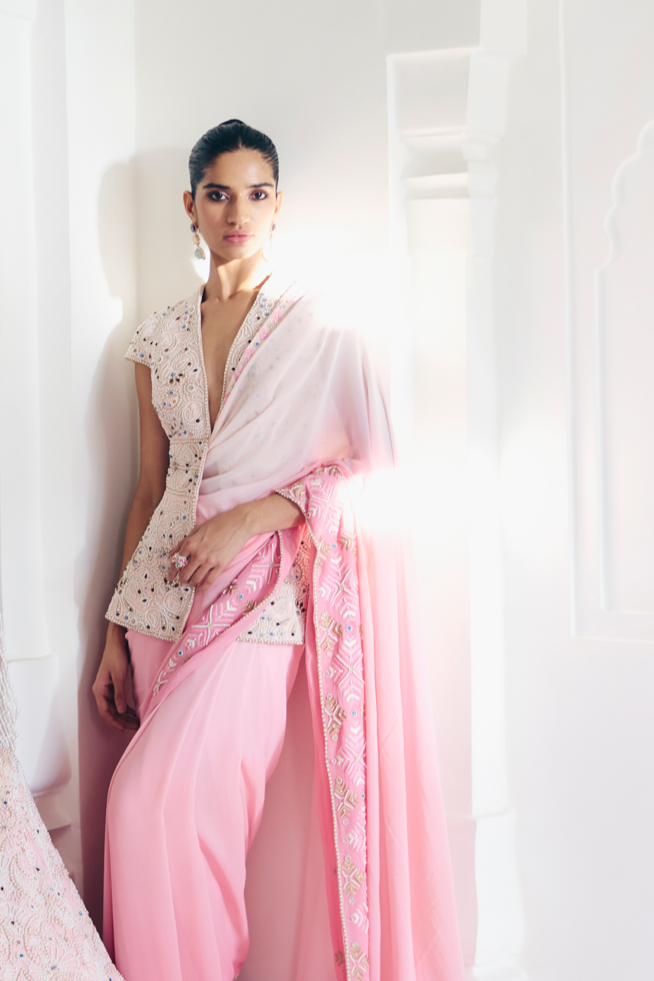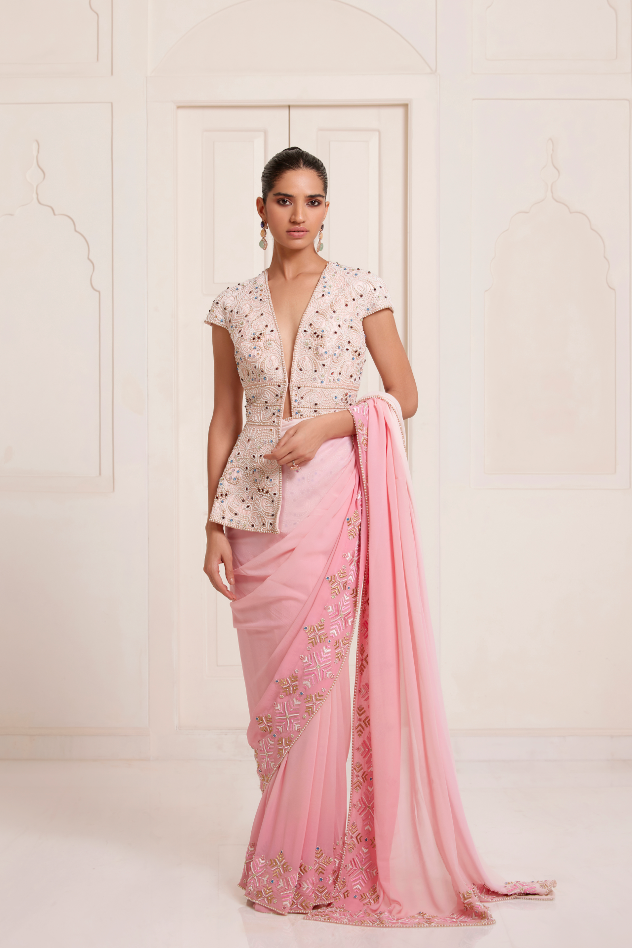 Pink jewel-embroidered halter blouse paired with a pink pre-stitched saree with embroidered borders
