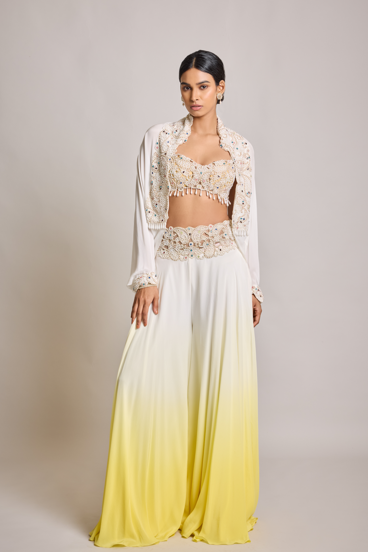 Ivory Yellow Ombre Flared Pants With Pearl Embroidered Belt