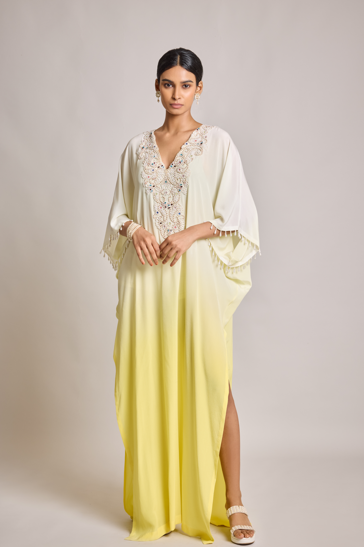 Ivory Yellow Ombre Kaftan With Pearl Embroidered Yoke