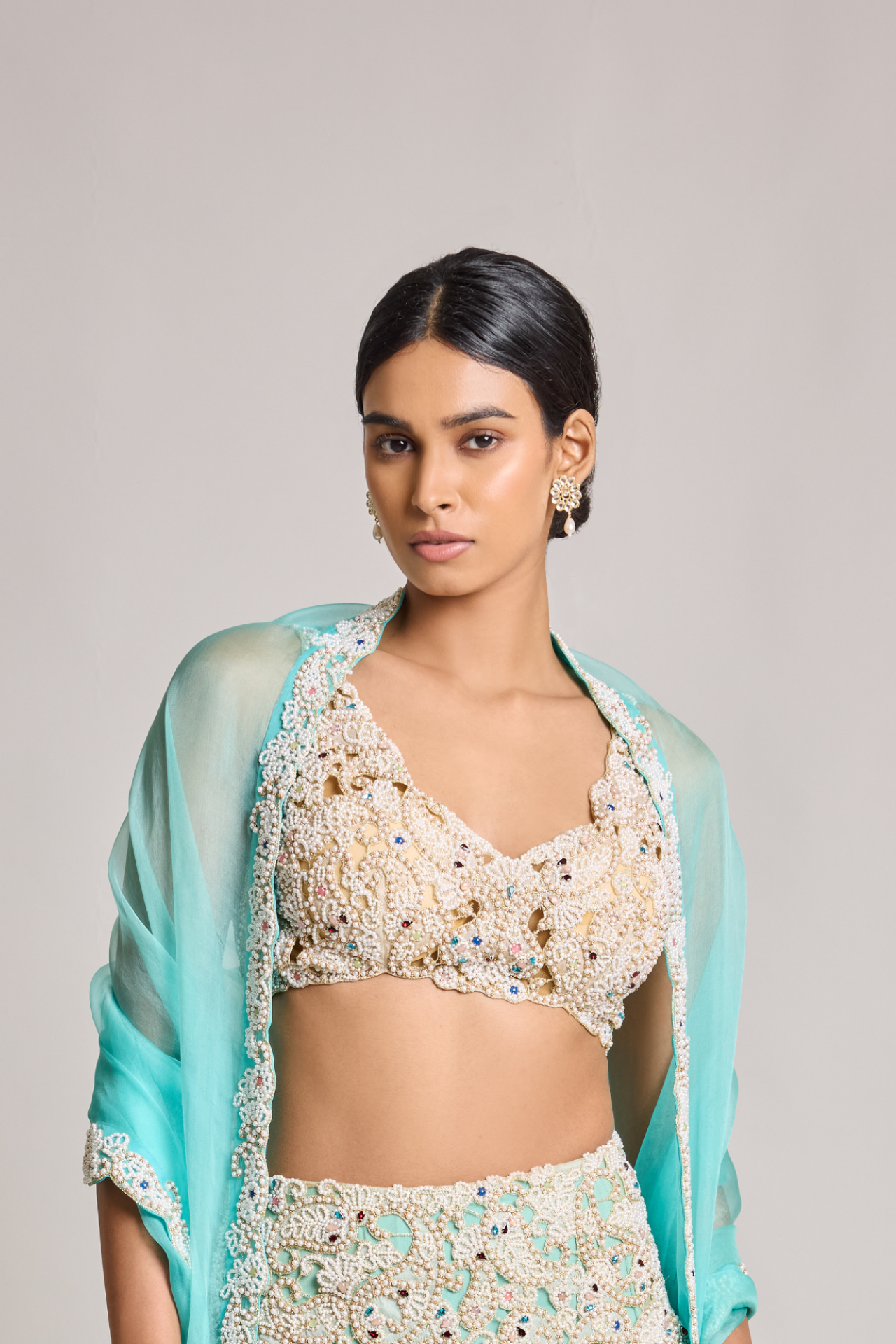 Turquoise Organza Dupatta With Pearl Embroidered Border