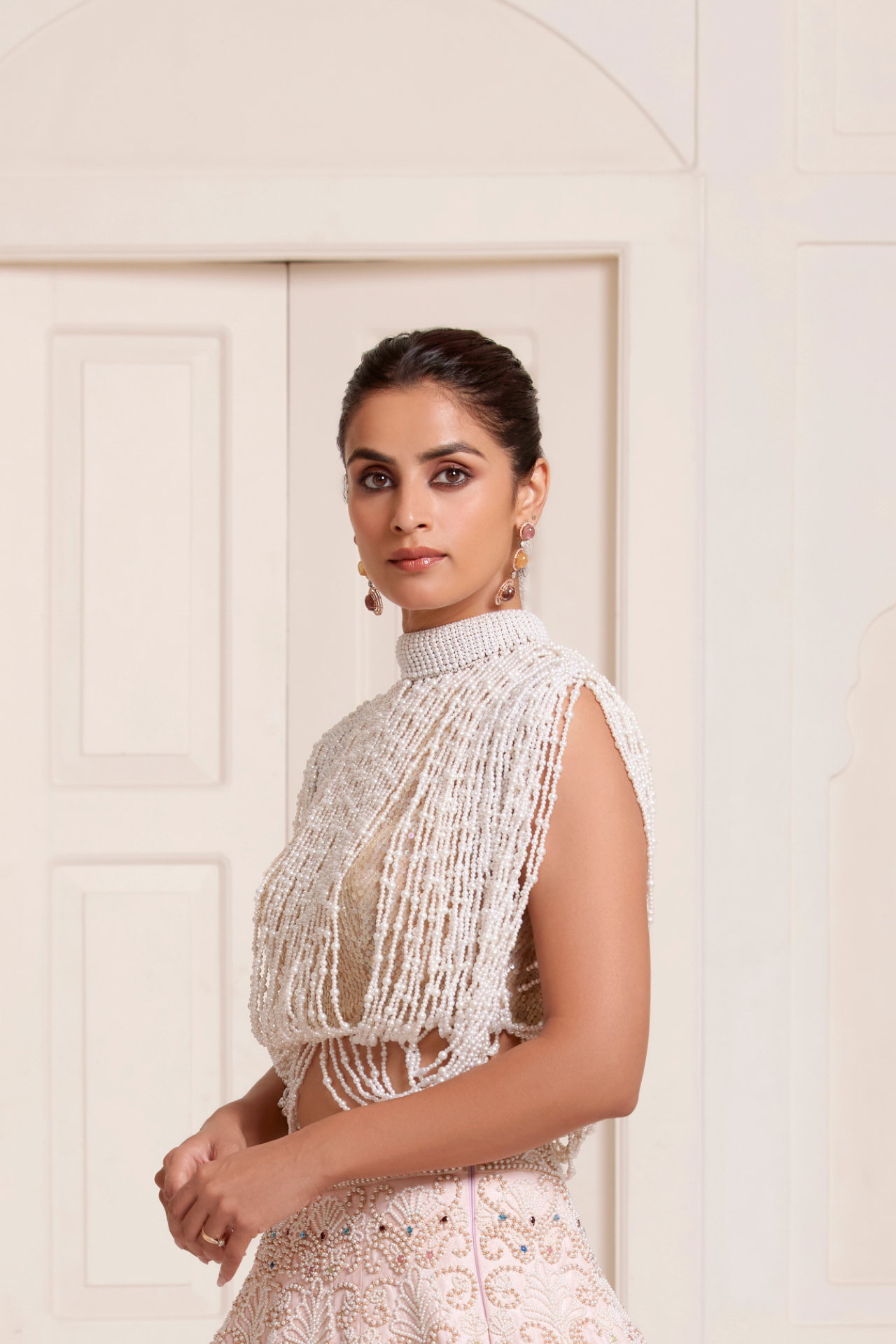 Pink bubble top with jewel-embroidered butties paired with bandhani wrap pants with embroidered waist