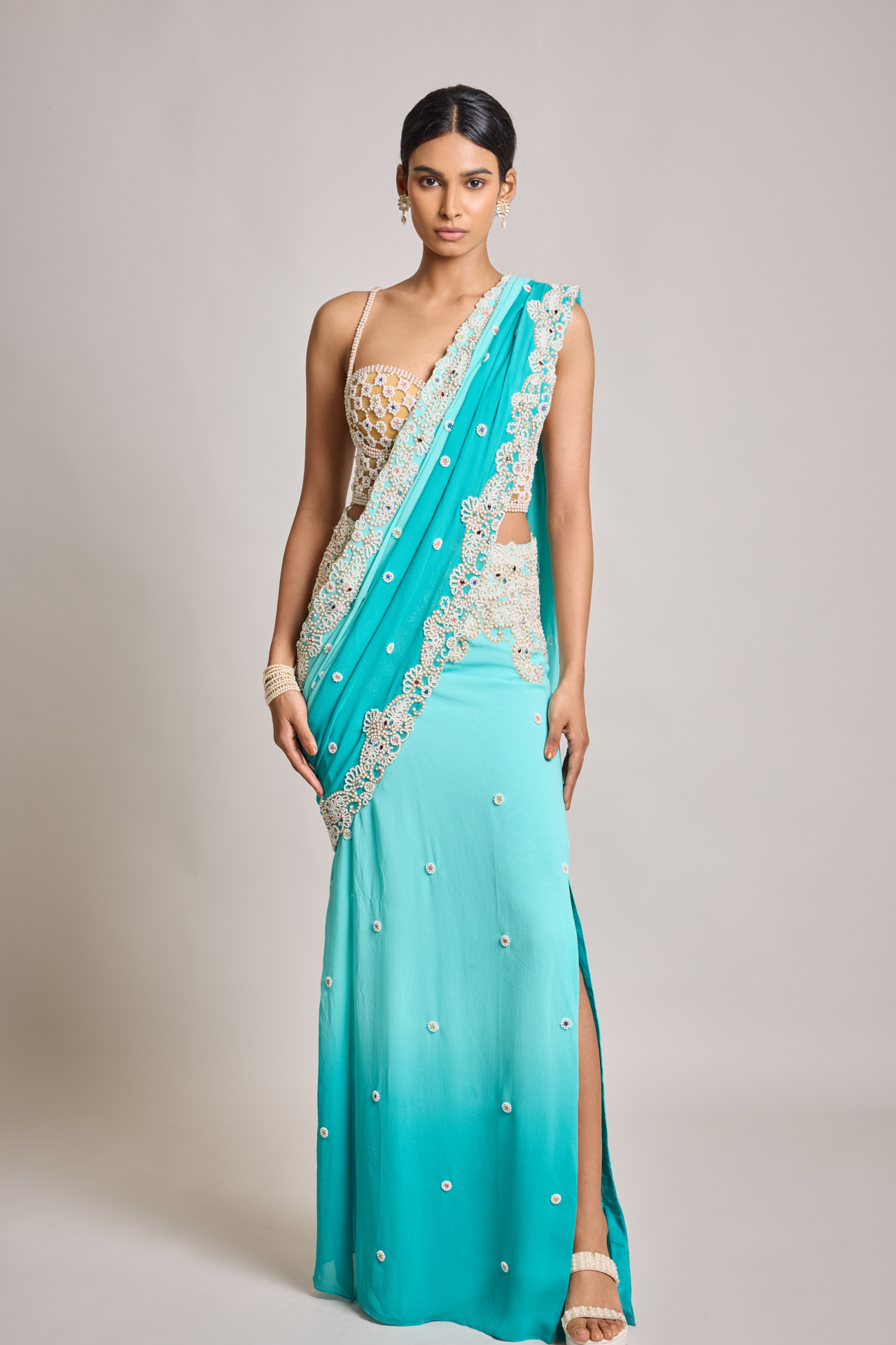 Turquoise Ombre Stitched Saree With Pearl Embroidered Pallu And Front Slit