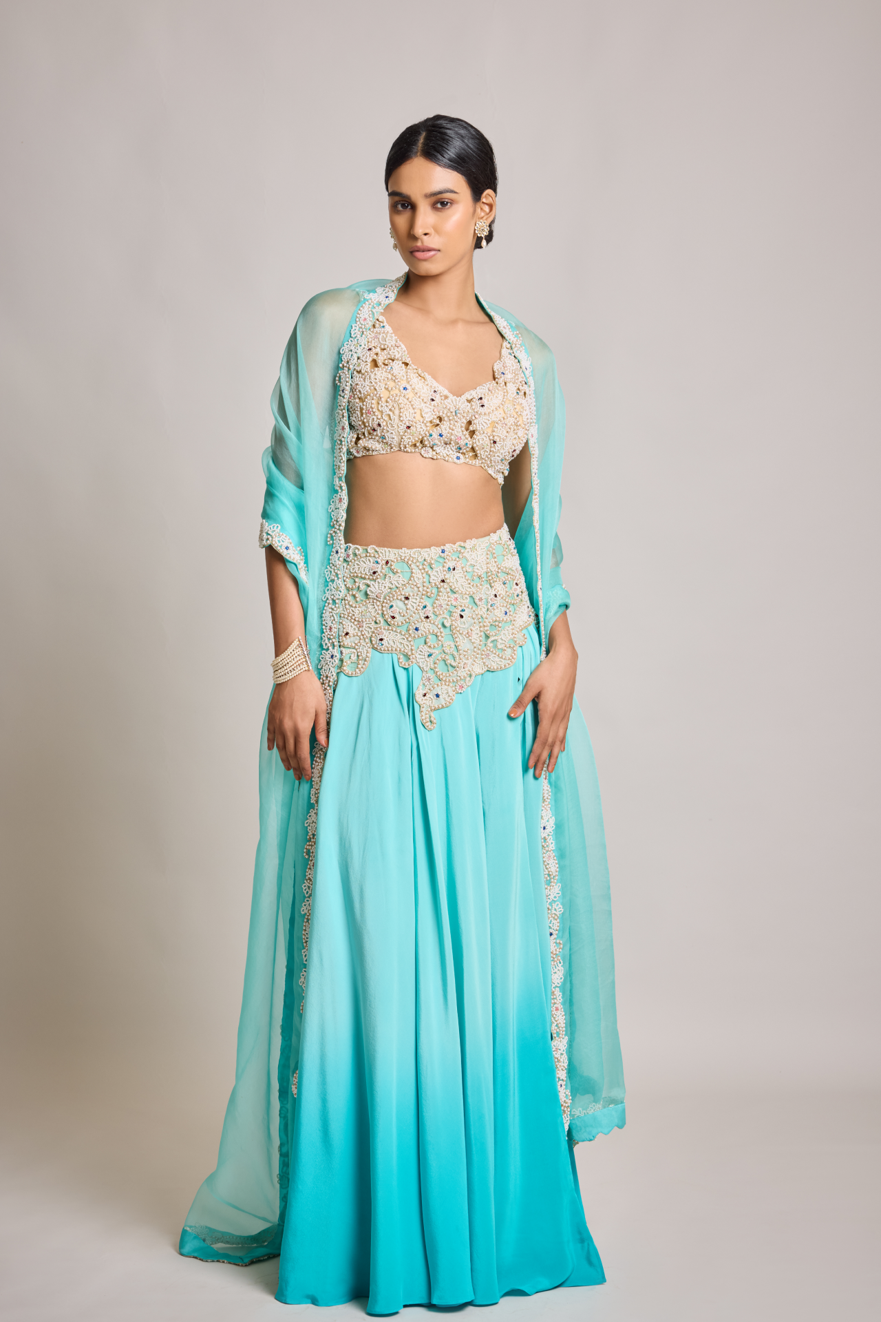 Turquoise Ombre Skirt With Pearl Embroidered Belt