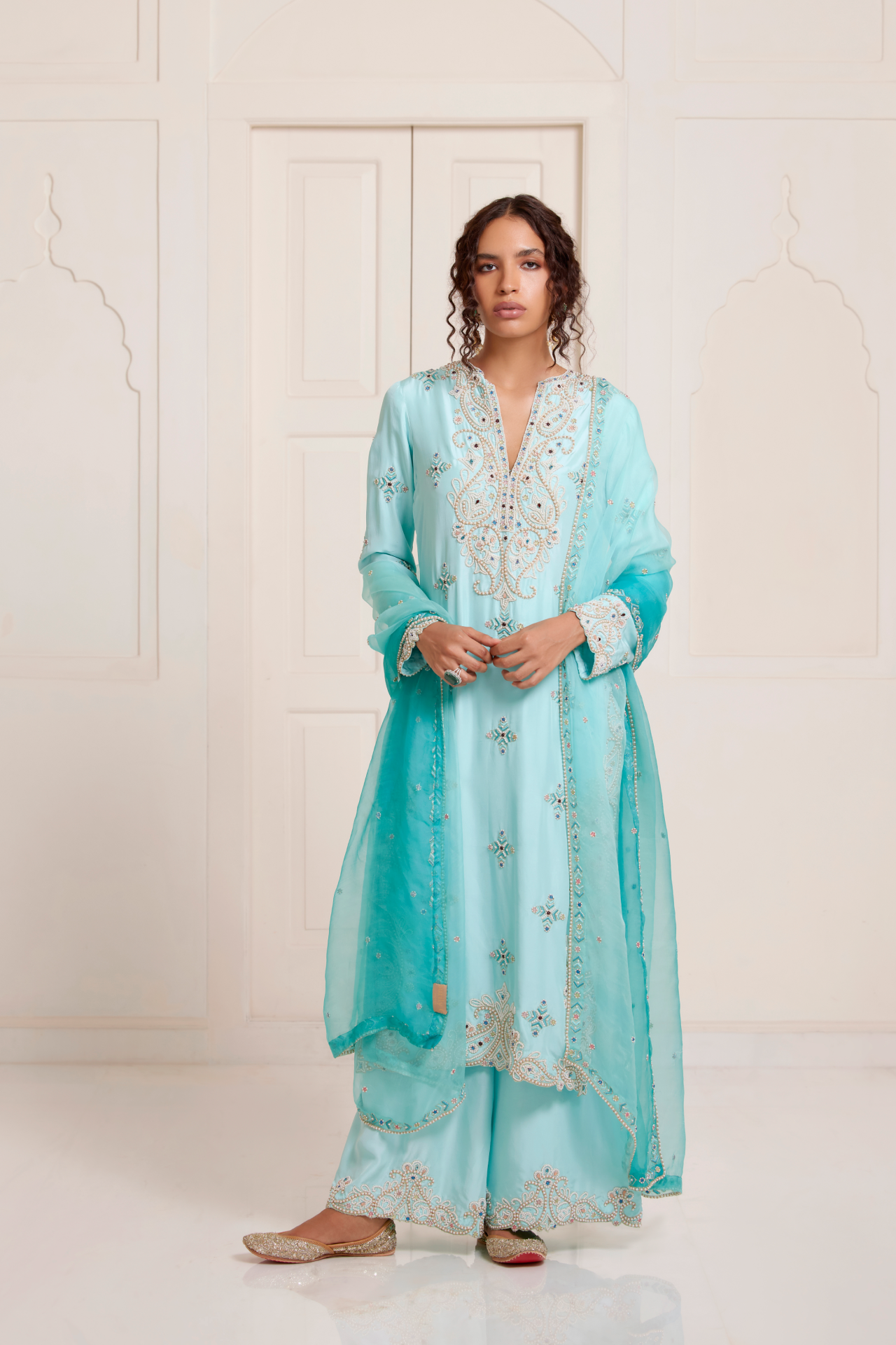 Turquoise Pearl Embroidered Yoke Kurta With Motifs