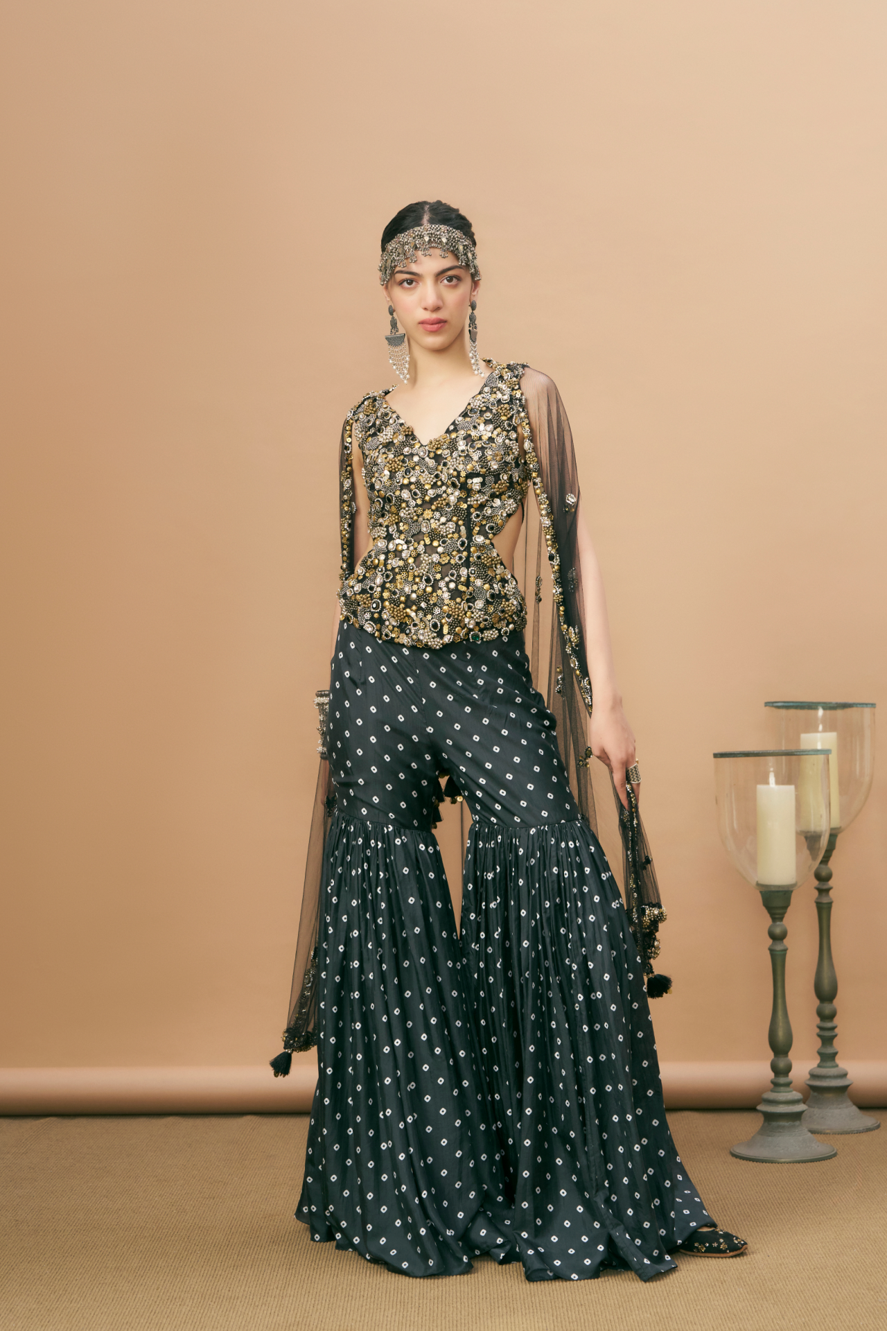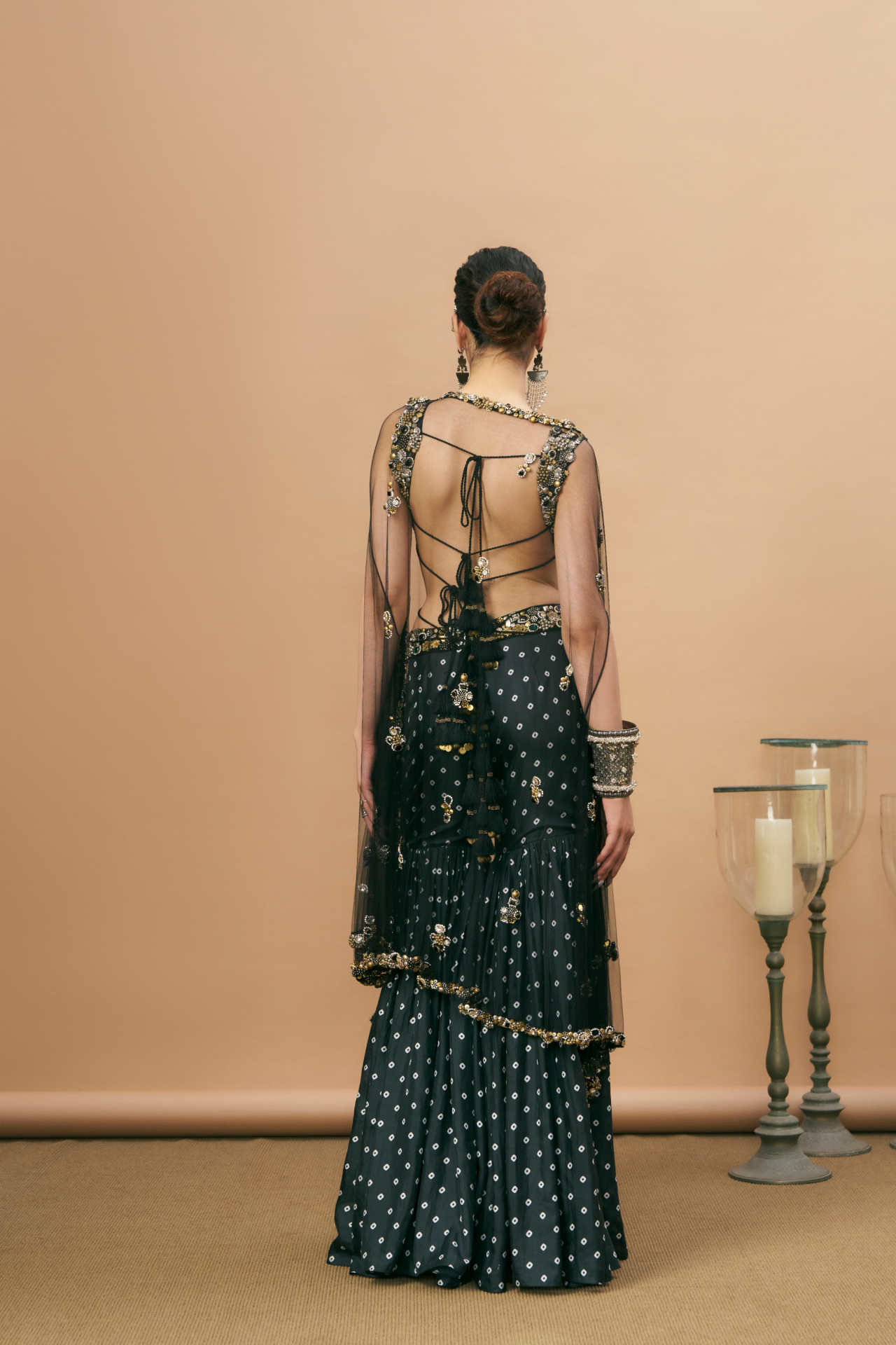 Black jewel-embroidered backless top paired with black bandhani sharara pants and a cape with jewel-embroidered border and butties