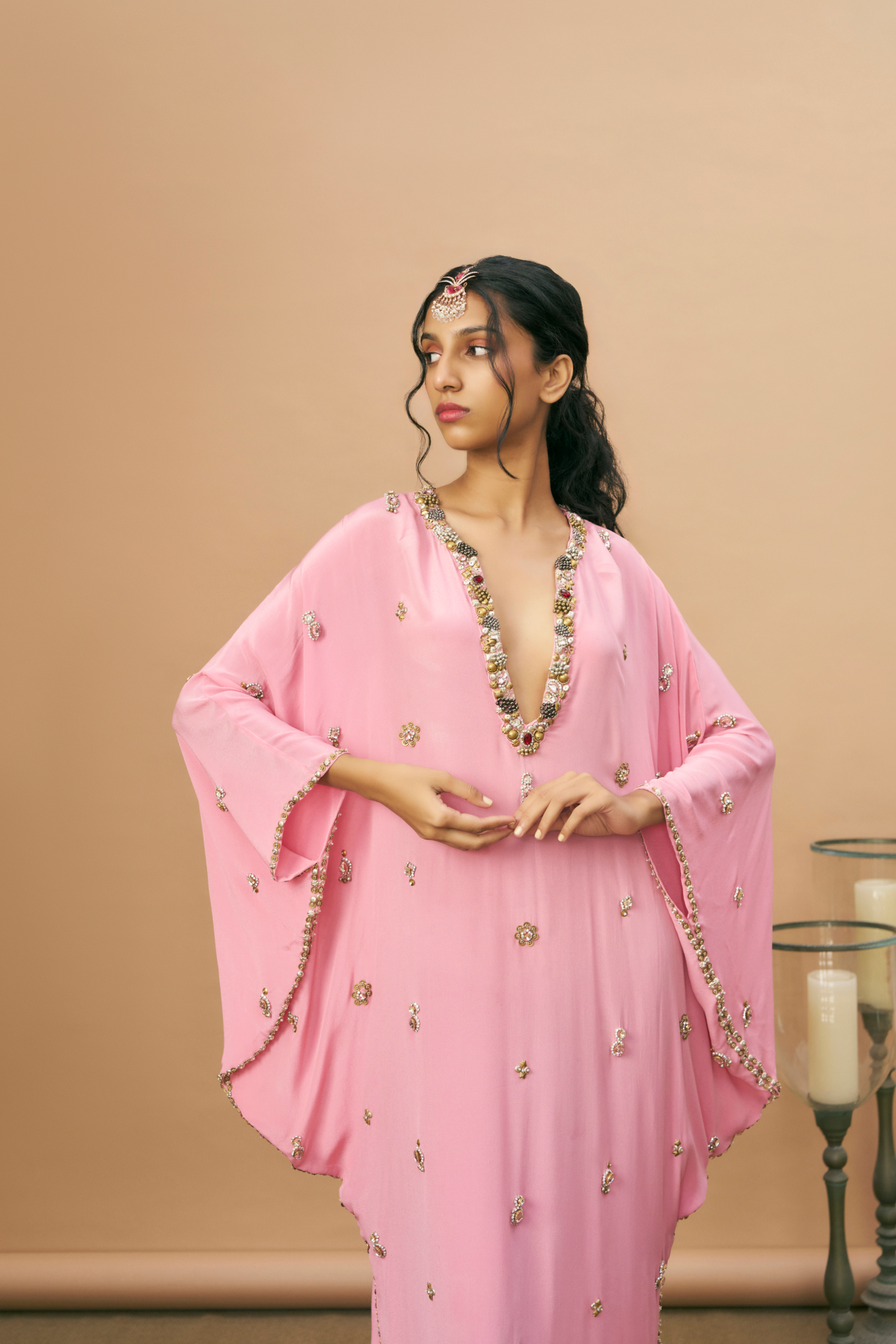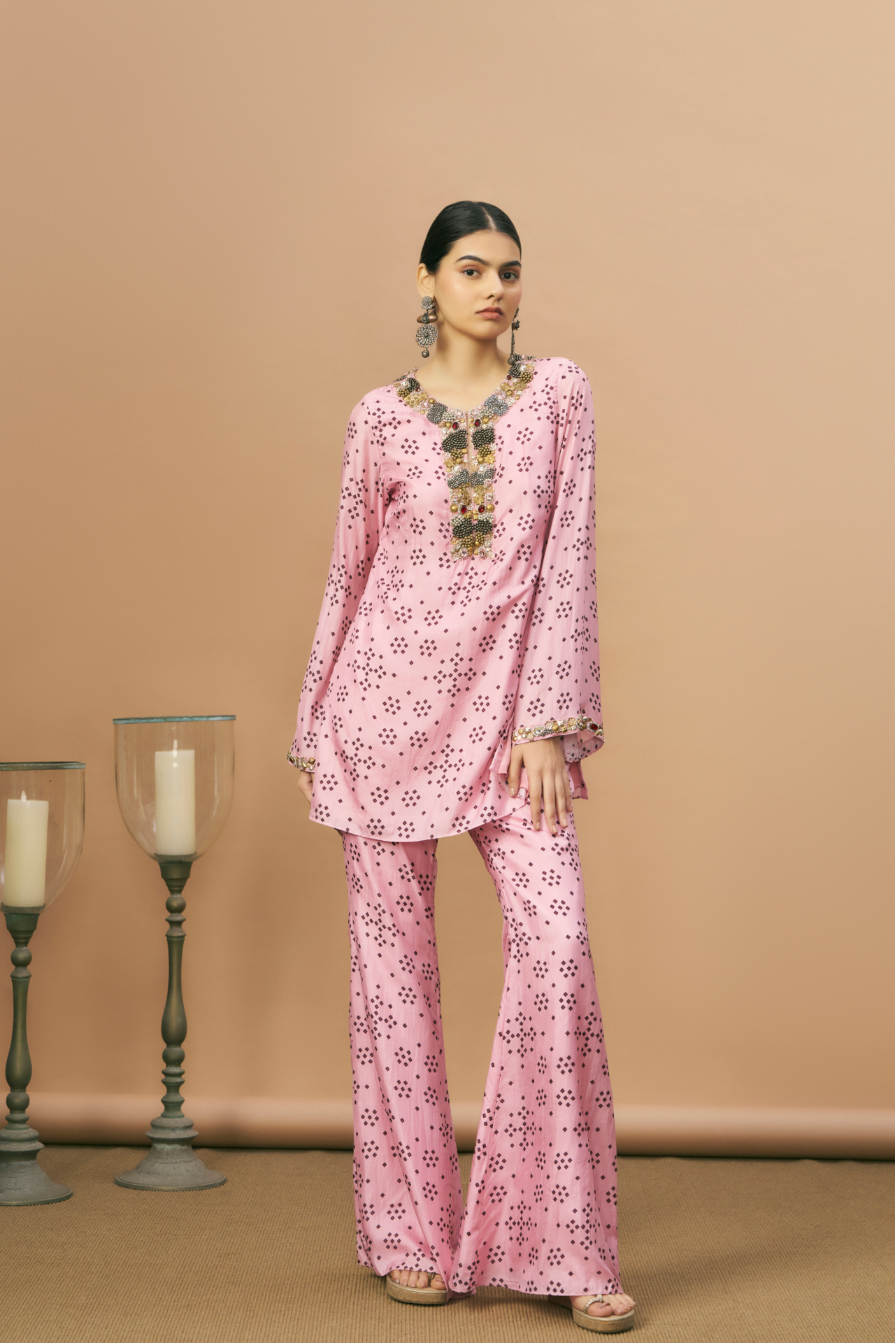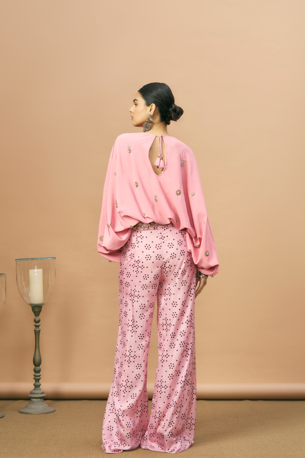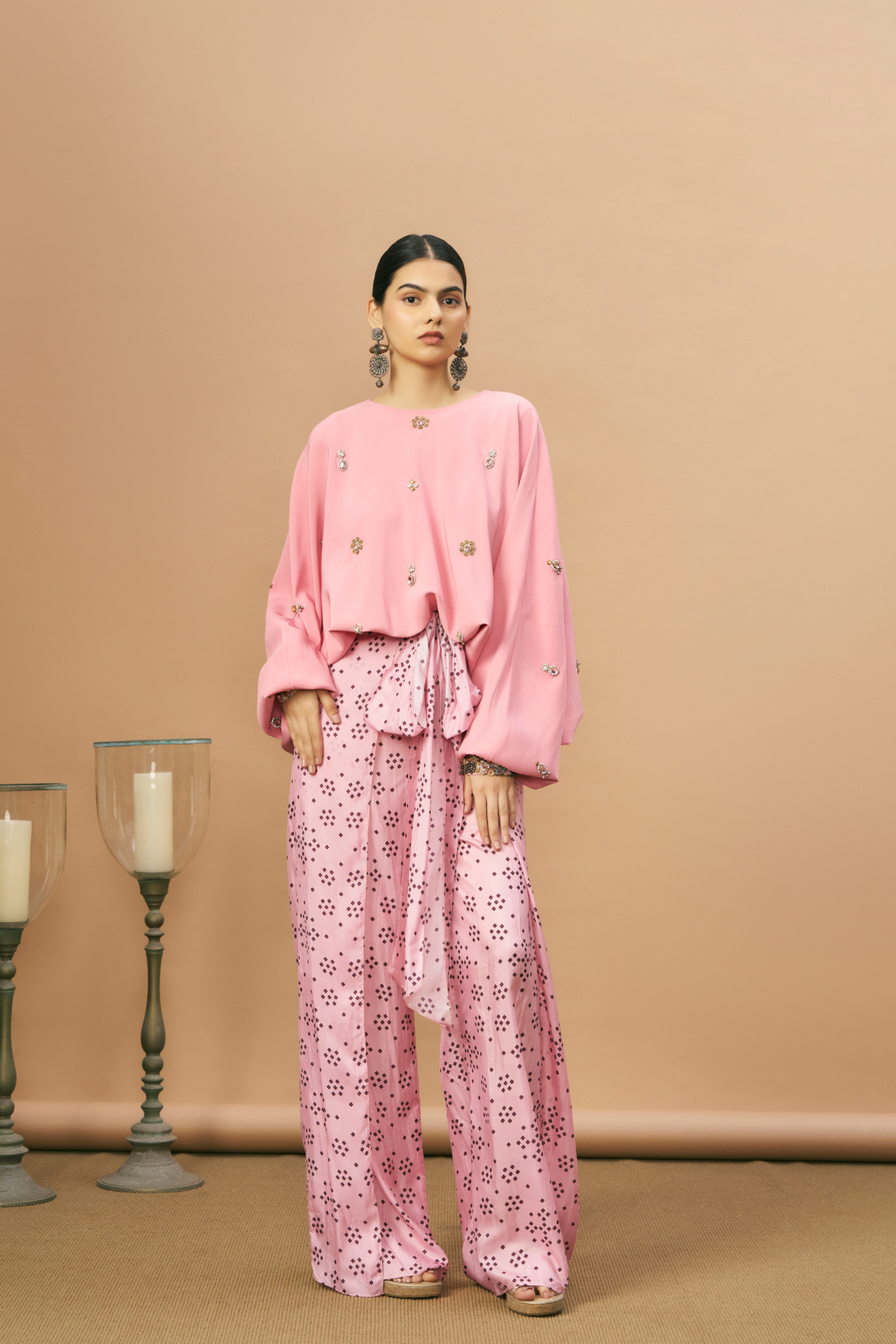 Pink bubble top with jewel-embroidered butties paired with bandhani wrap pants with embroidered waist