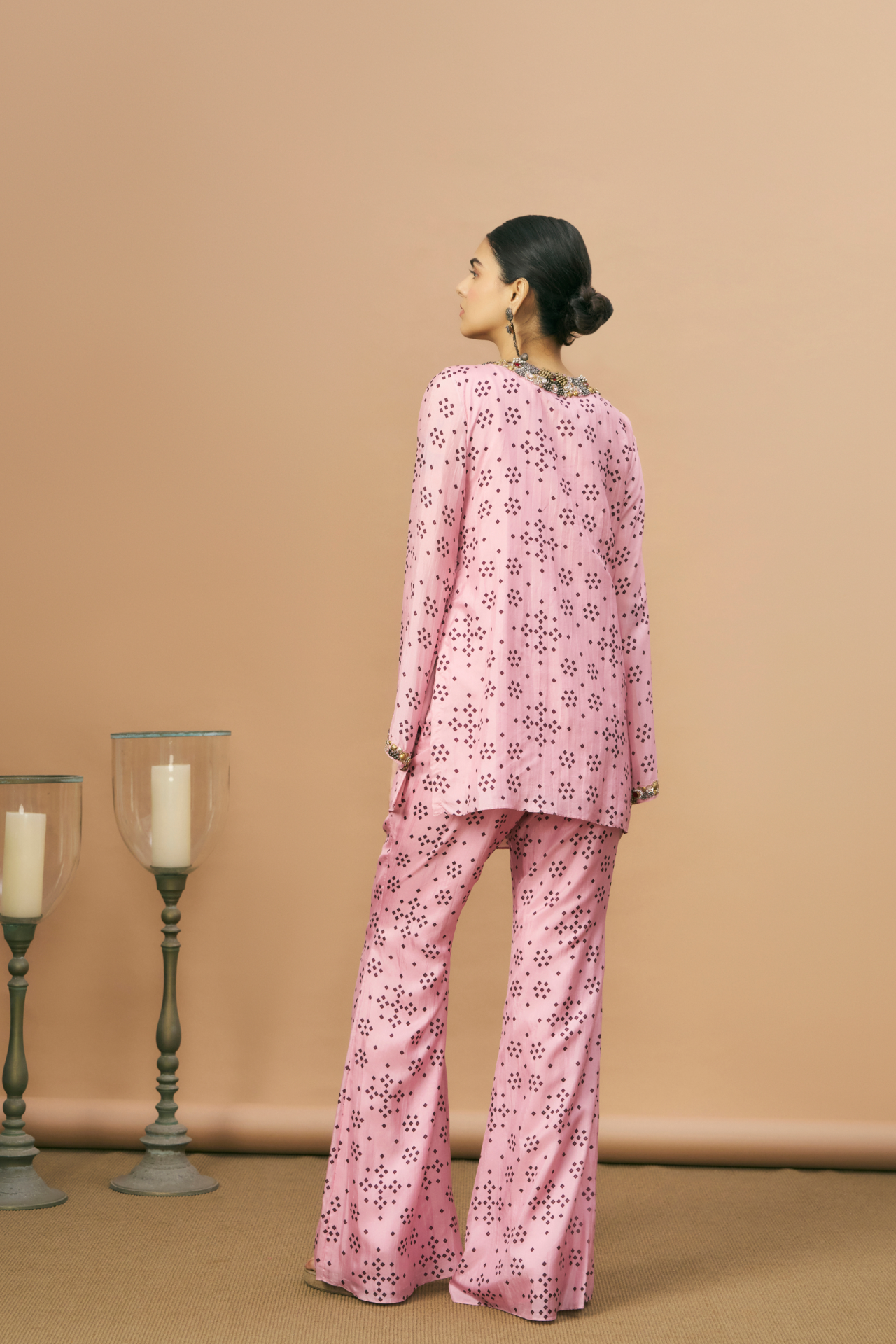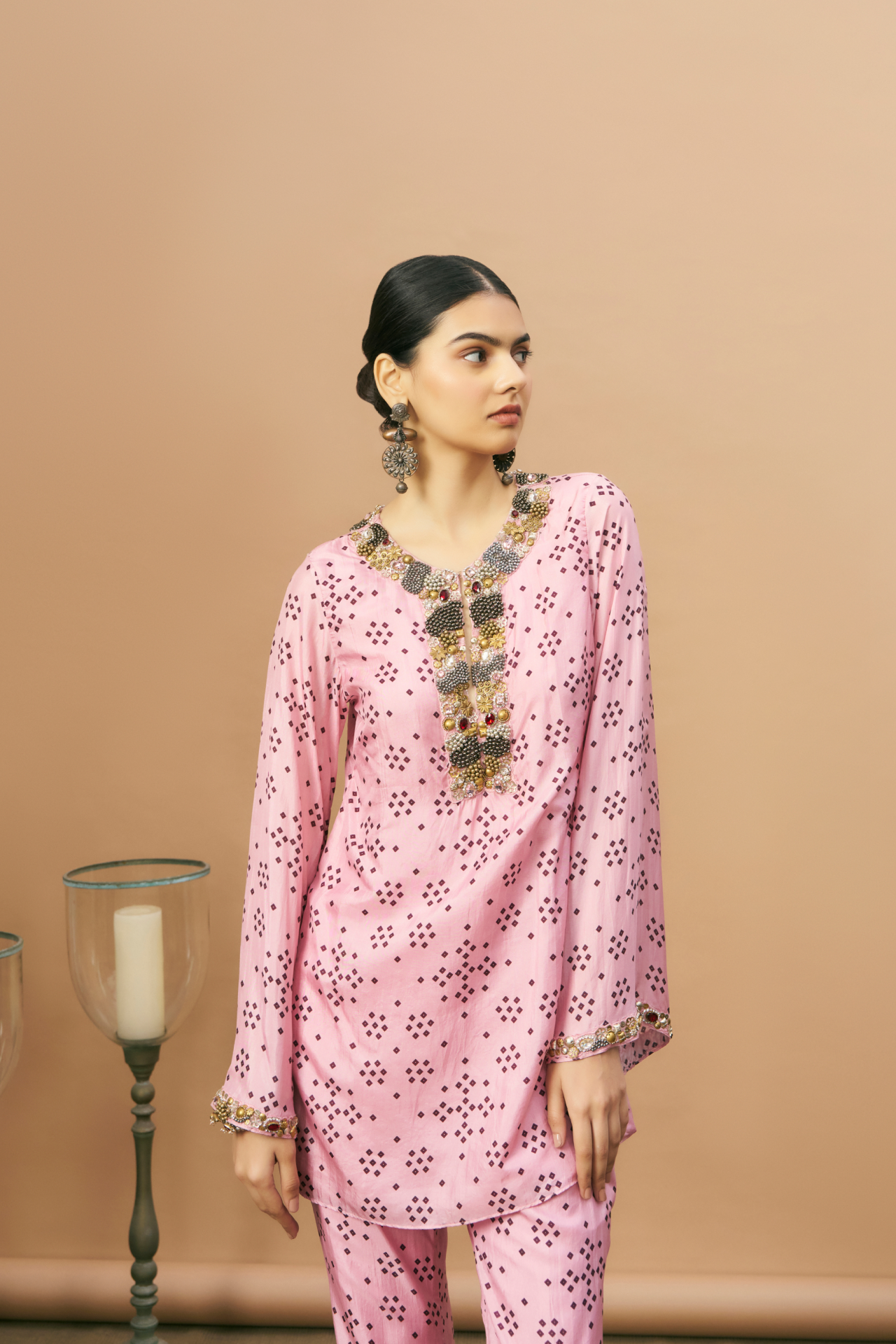 Pink bandhani kurta paired with straight pants with jewel-embroidered neckline and waist