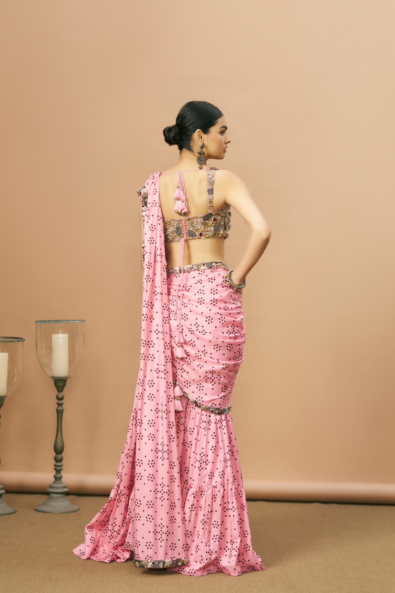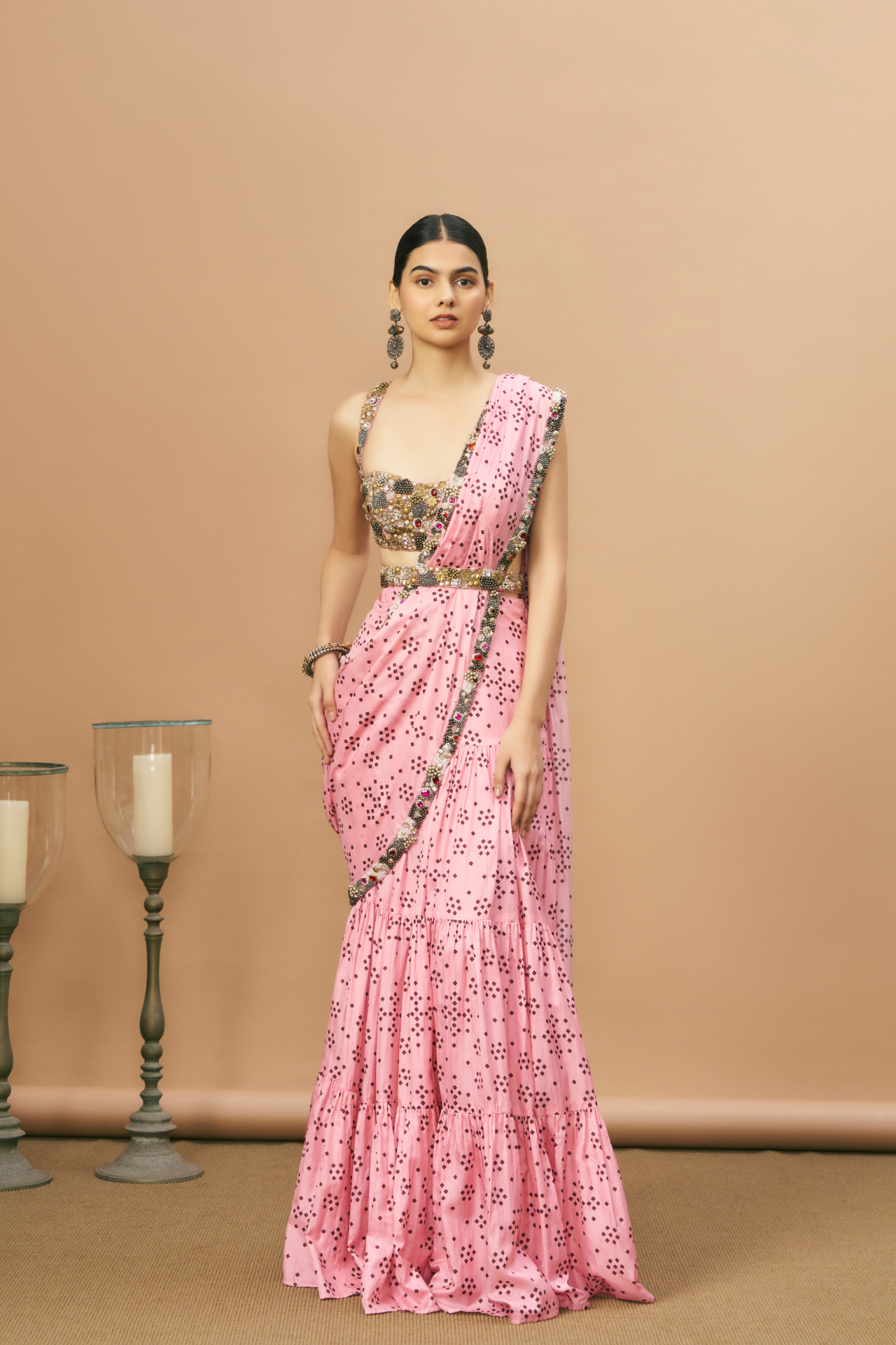 Pink jewel-embroidered blouse paired with a pink bandhani pre-stitched saree with jewel-embroidered borders and embroidered belt