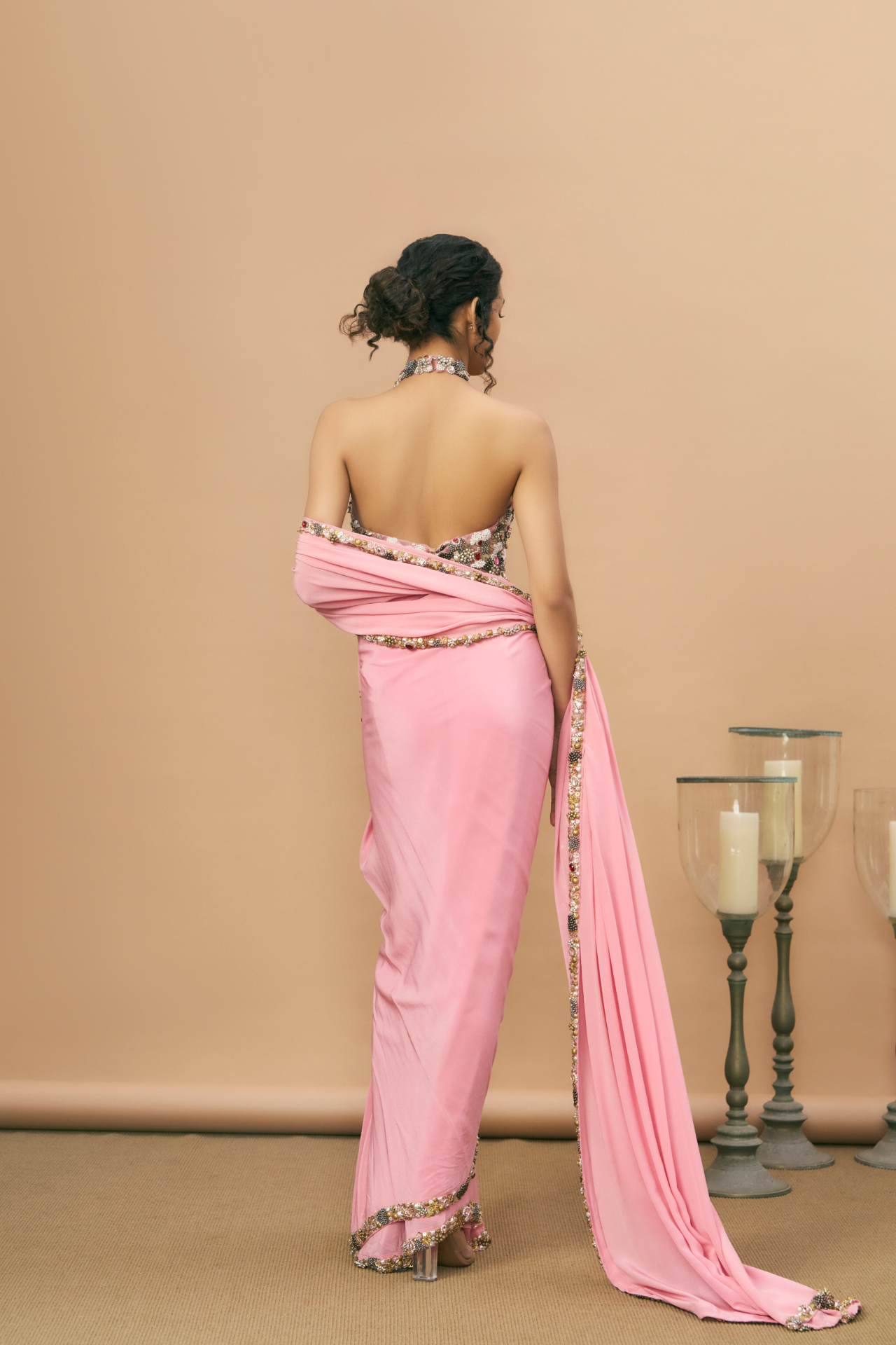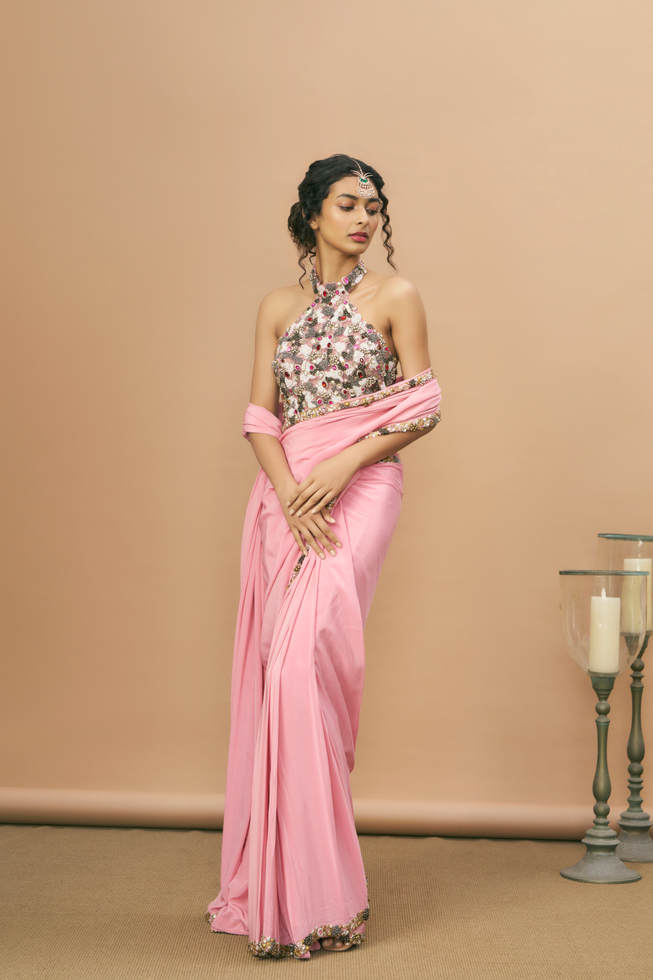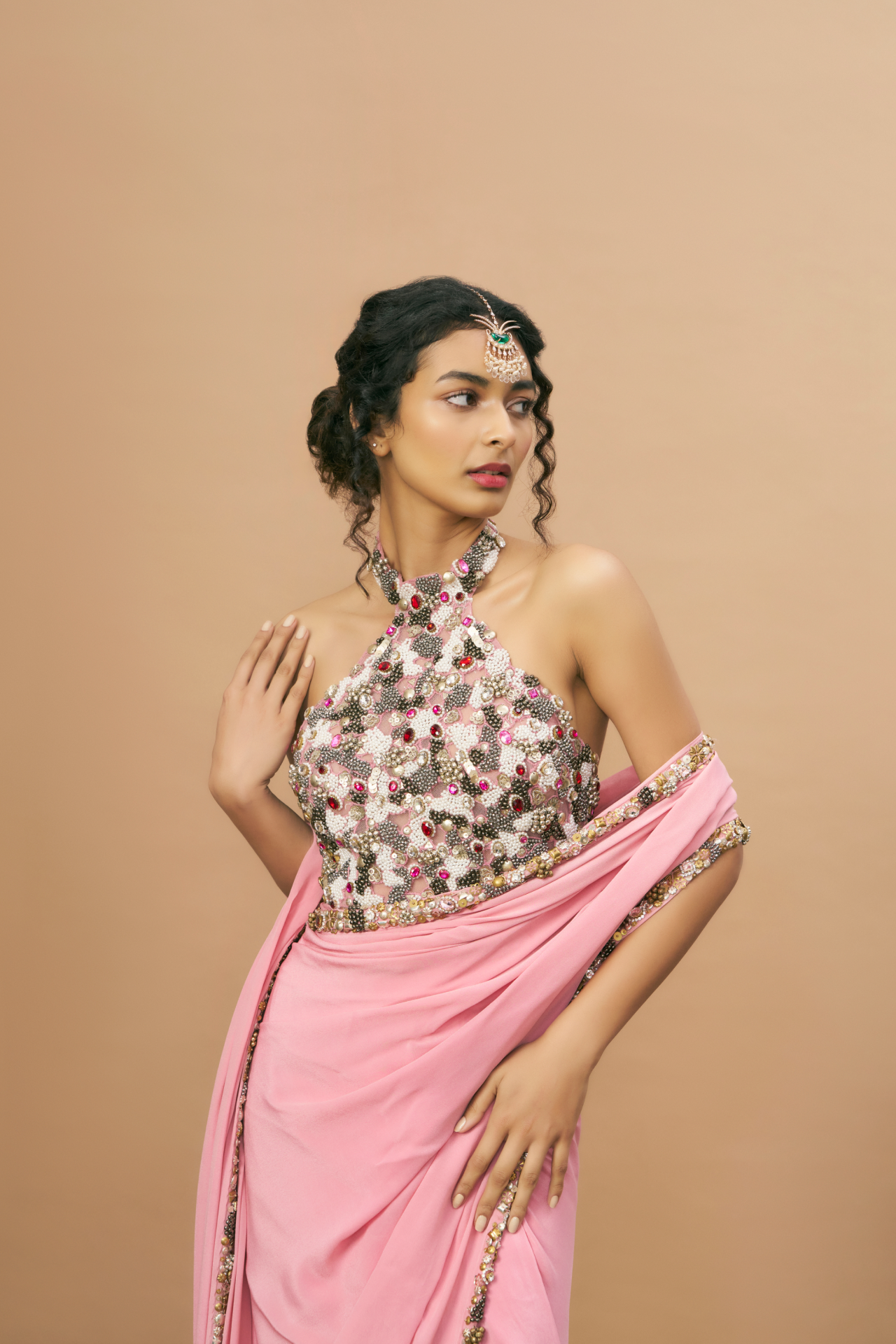 Pink jewel-embroidered halter blouse paired with a pink pre-stitched saree with embroidered borders
