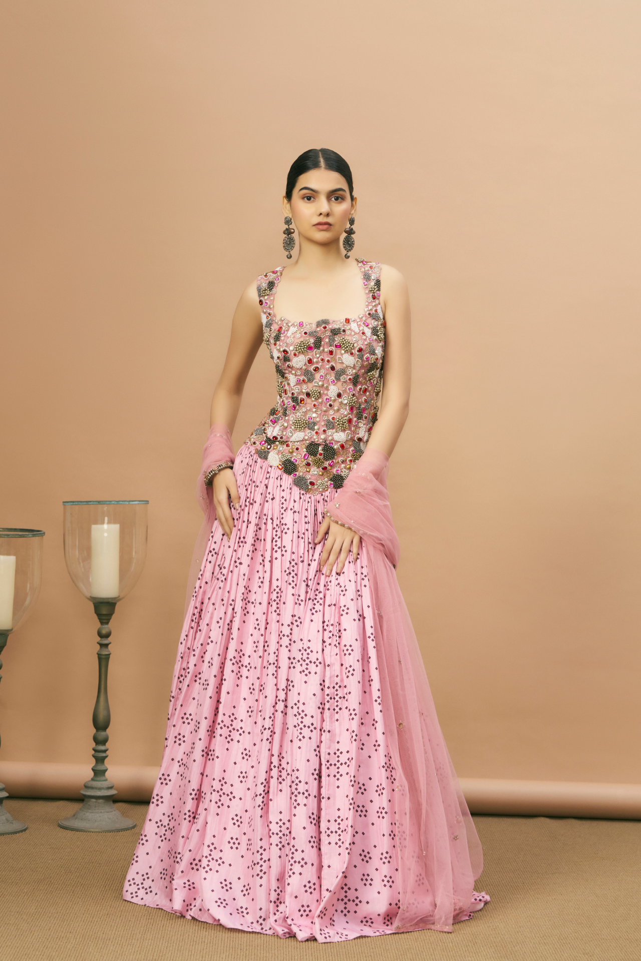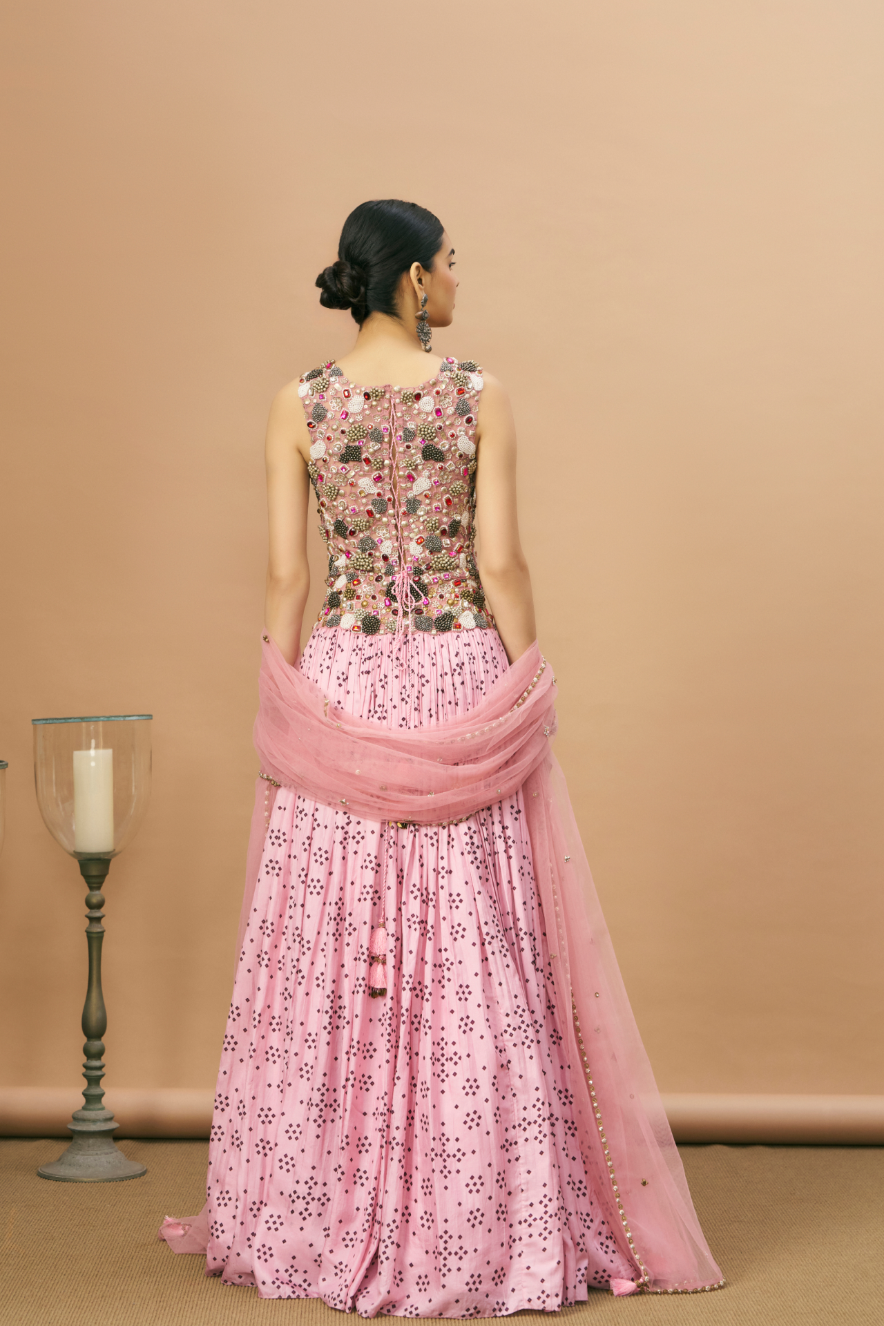 Pink jewel-embroidered sleeveless top paired with a pink bandhani flared skirt with jewel-embroidered waist and net dupatta with embroidered border and butties
