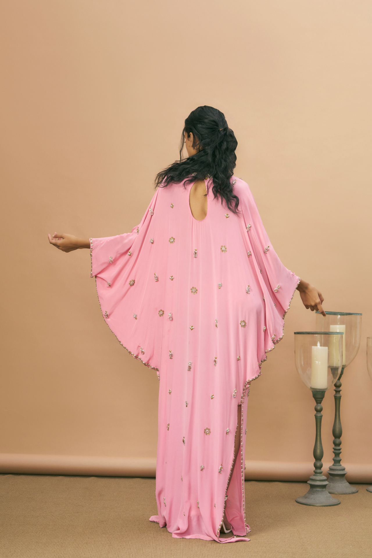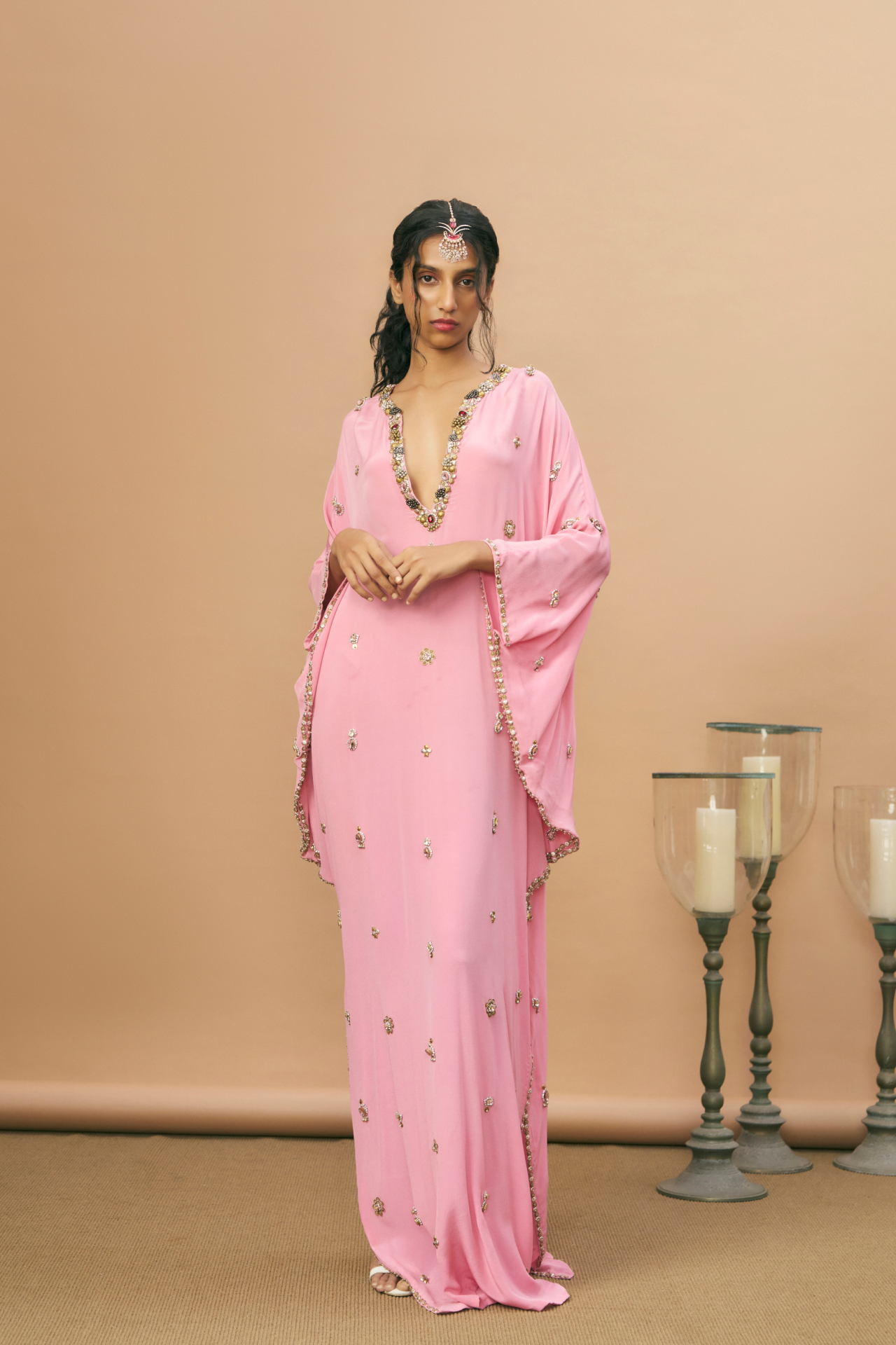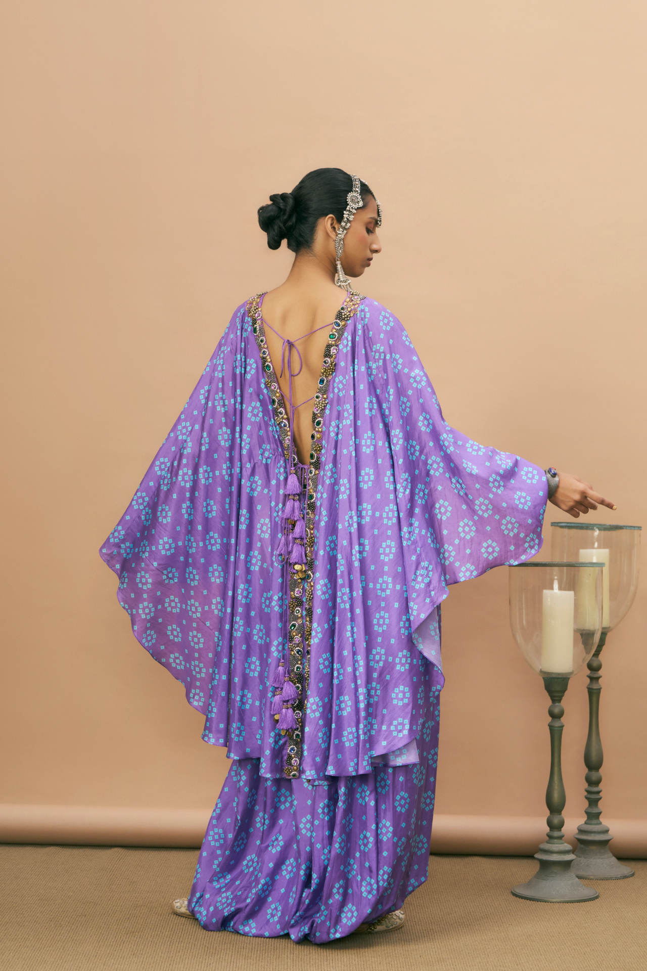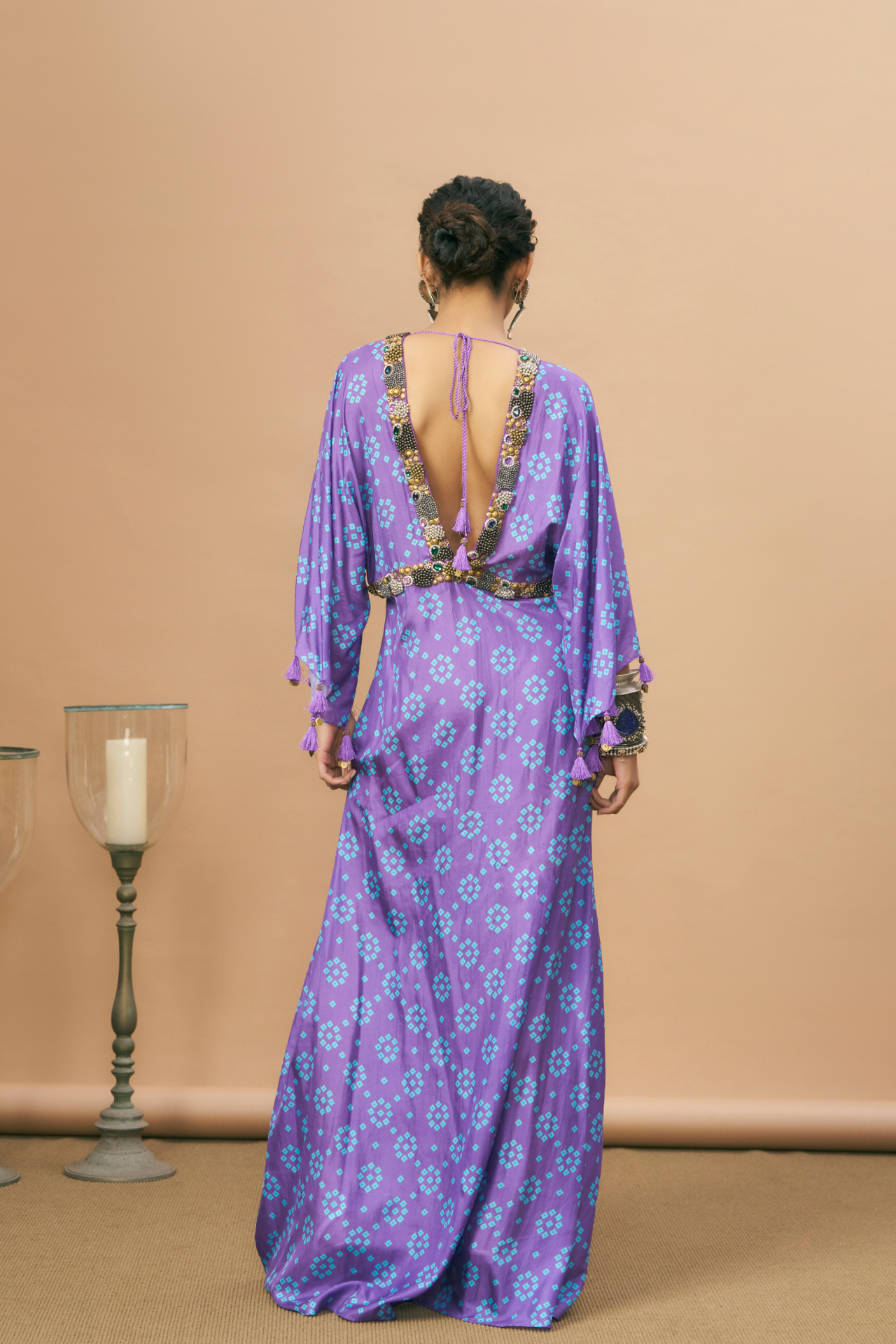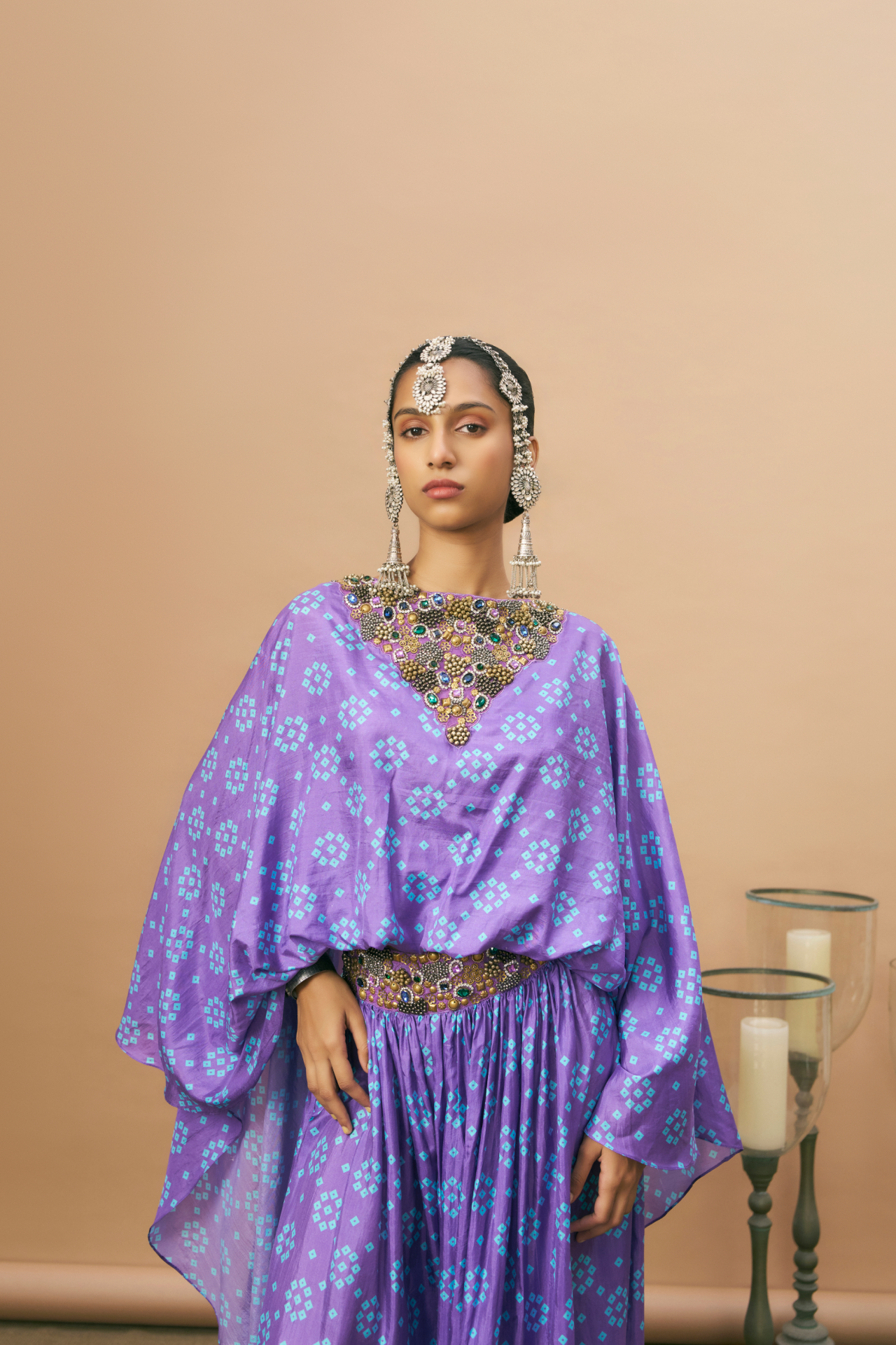 Purple bandhani kaftan with jewel-embroidered neckline and waist