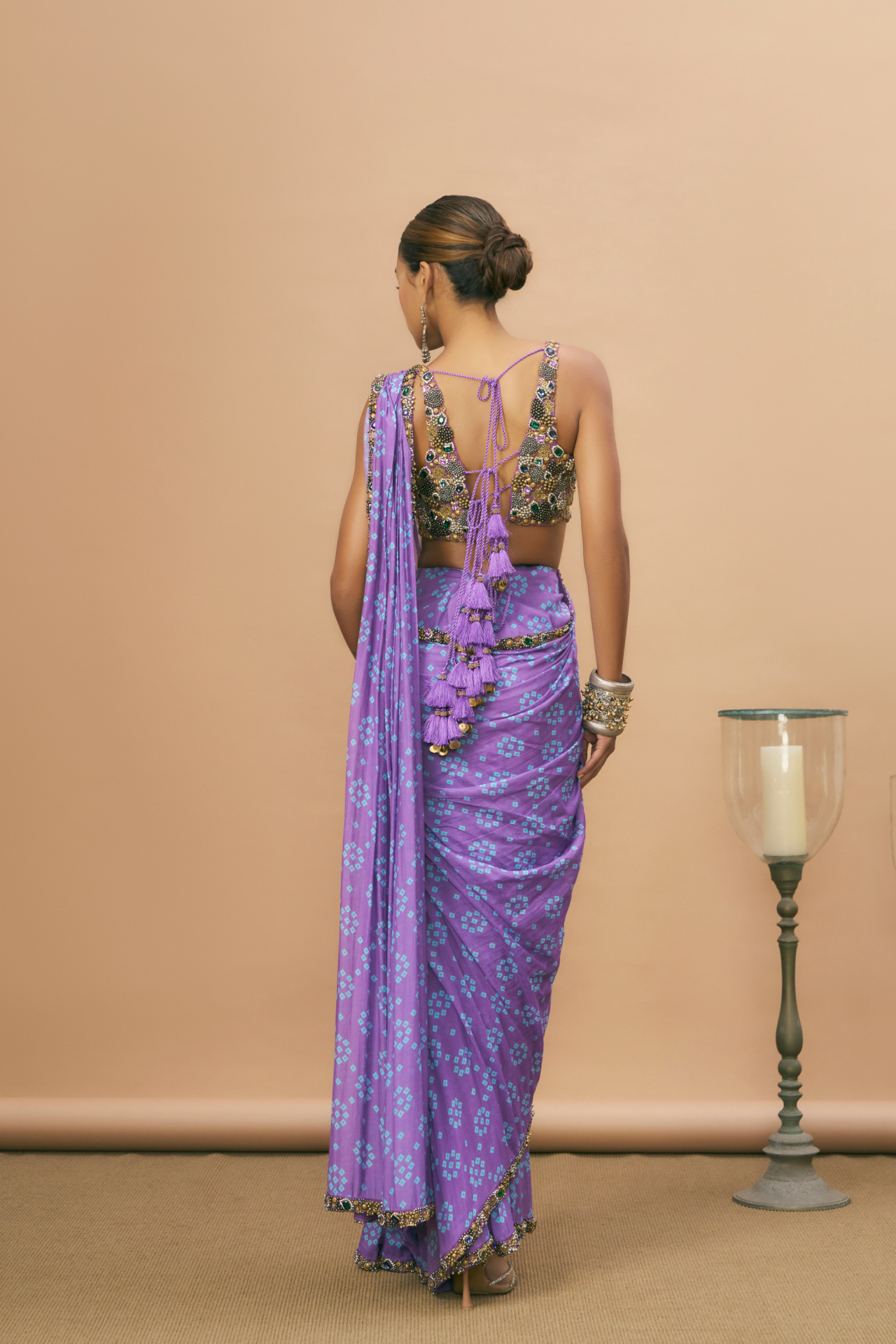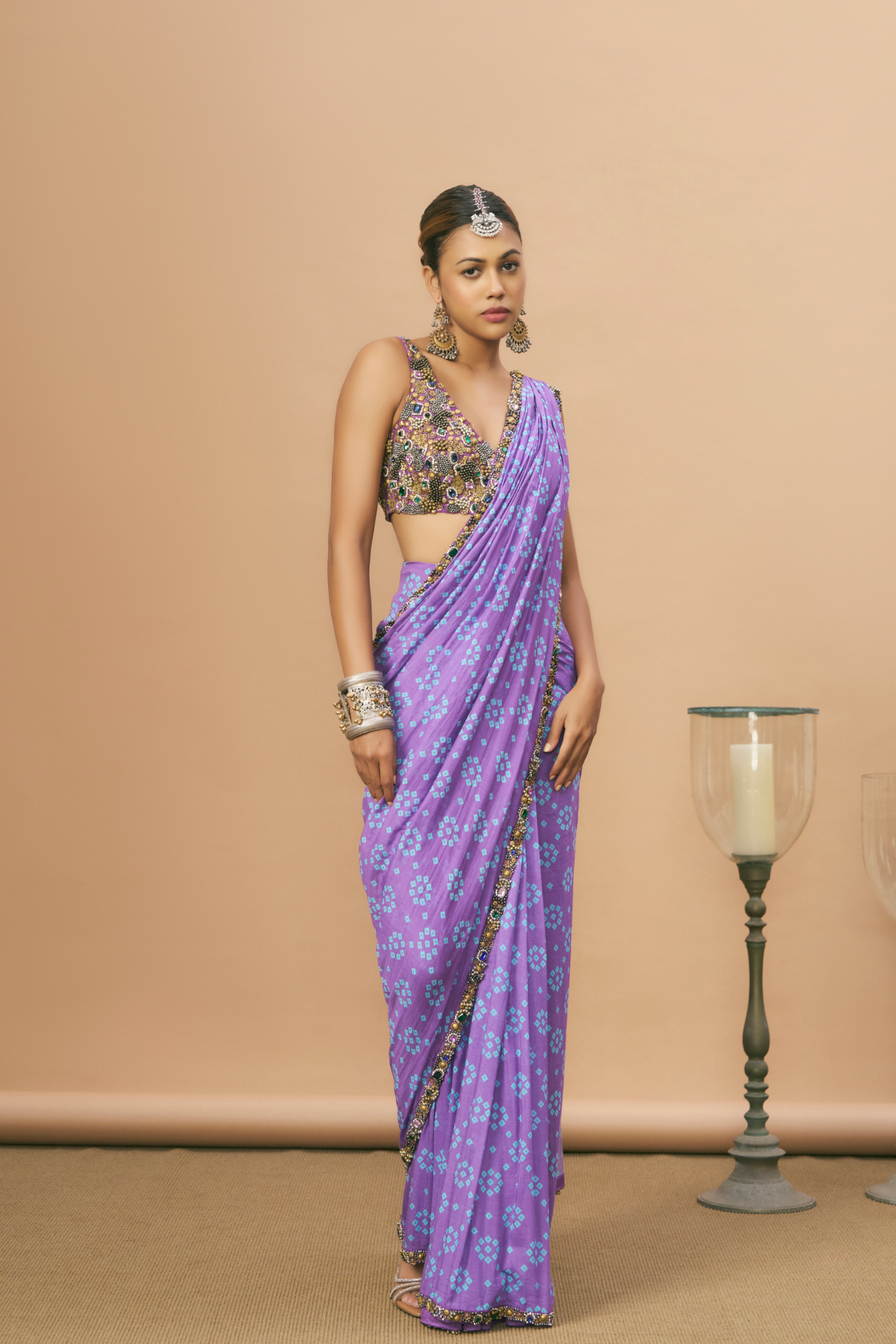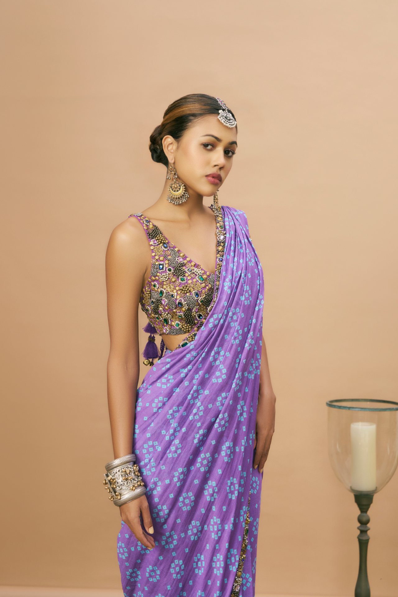 Purple jewel-embroidered blouse paired with a purple bandhani pre-pleated saree with jewel-embroidered border