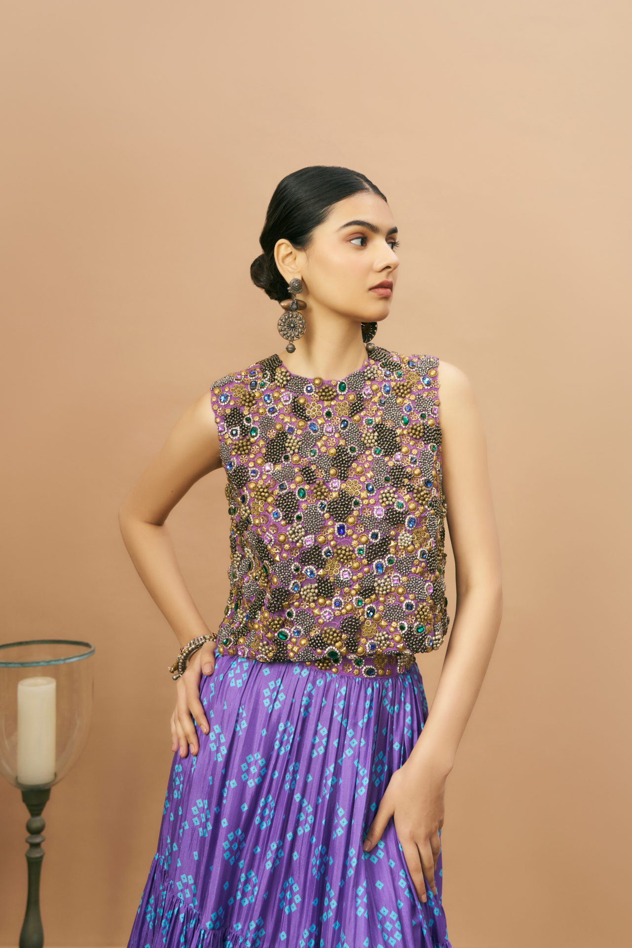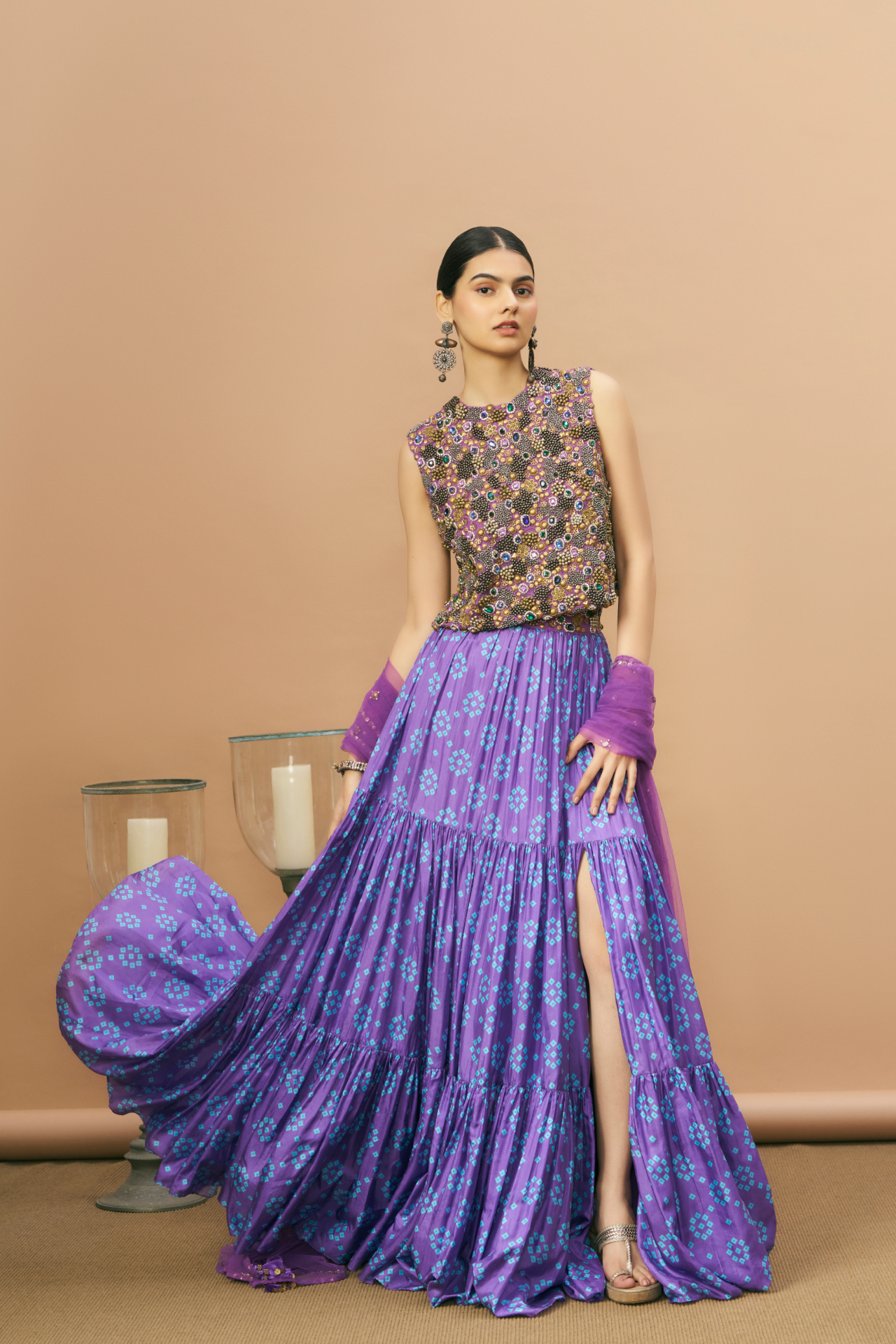 Purple jewel-embroidered blouse paired with a purple bandhani tiered skirt and net dupatta with jewel-embroidered border and butties