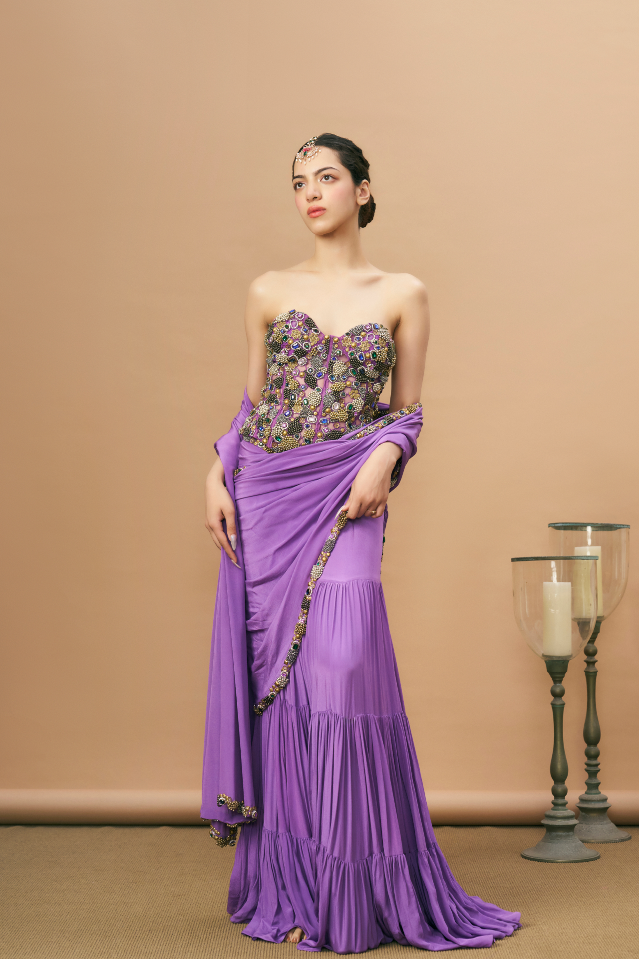 Purple jewel-embroidered corset paired with a purple pre-stitched saree with jewel-embroidered borders