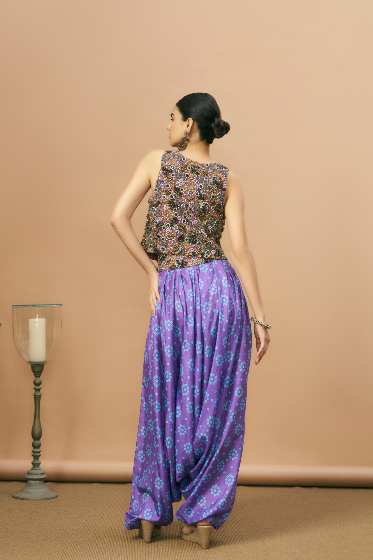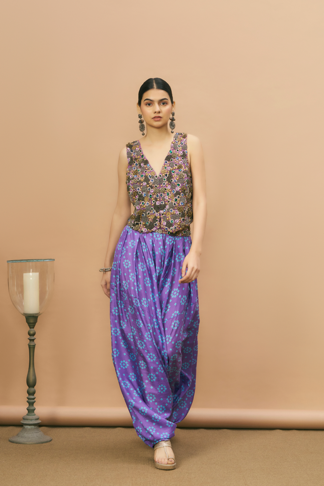 Purple jewel-embroidered waistcoat paired with purple bandhani harem pants with jewel-embroidered waist
