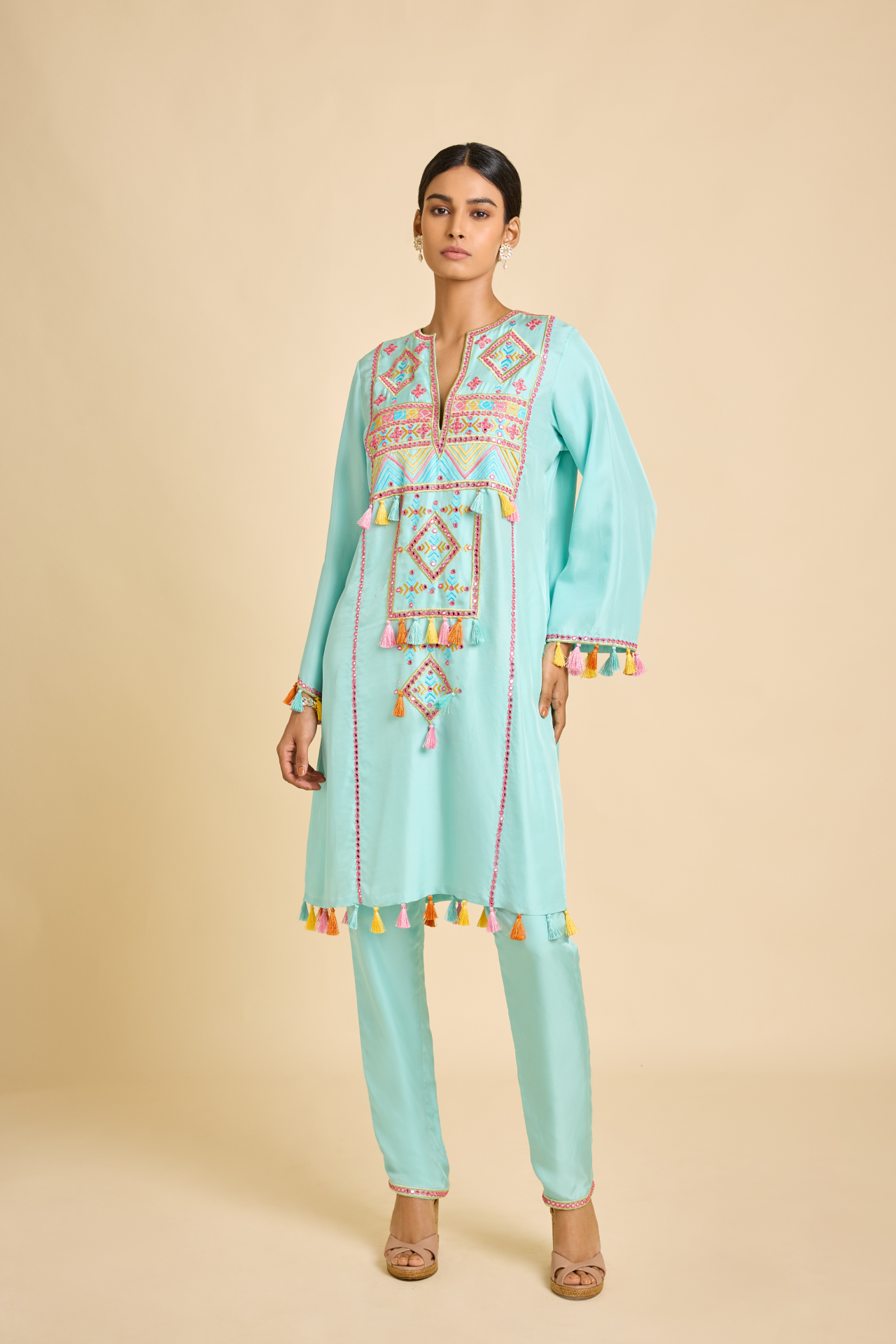 Blue Short Kurta With Multi Color Embroidered Yoke