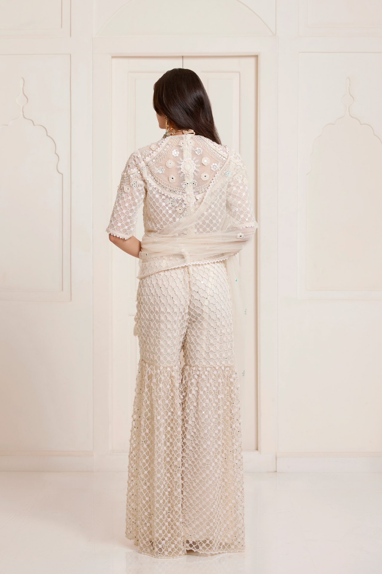 Delicate and lightweight, this net dupatta is hand-embroidered with pearls, mirrors, and subtle crochet florals.